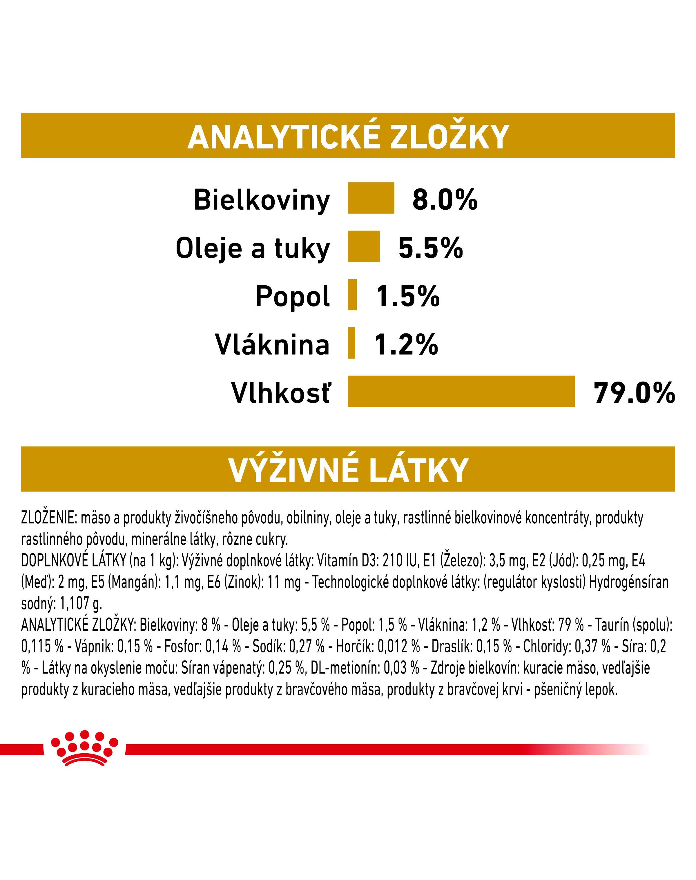 mäso a živočíšne produkty (kura, bravčové), obilniny, oleje a tuky, bielkovinové extrakty rastlinného pôvodu (kukuričný glutén), vedľajšie produkty rastlinného pôvodu, minerálne látky, cukry.DOPLŇKOVÉ LÁTKY (v 1 kg): Výživné doplnkové látky: Vitamín D3: 130 mj., E1 (Železo): 4 mg, E2 (Jód): 0,2 mg, E4 (Meď): 1,3 mg, E5 (Mangán): 1,2 mg, E6 (Zinok): 12 mg - technologické doplnkové látky: trifosforečnan pentasodný: 1,5 g. ANALYTICKÉ ZLOŽKY: Proteín: 6% - Obsah tuku: 5,5% - Hrubý popol: 1,5% - vláknina: 1% - Vlhkosť: 80% - Vápnik (Ca ): 0,18% - Fosfor (P): 0,18% - Sodík (Na): 0,14% - Horčík (Mg): 0,025% - Draslík (K): 0,14% - Chloridy: 0,18 % - Síra (S): 0,13% - Látky okysľujúce moč: síran vápenatý, metionín.
