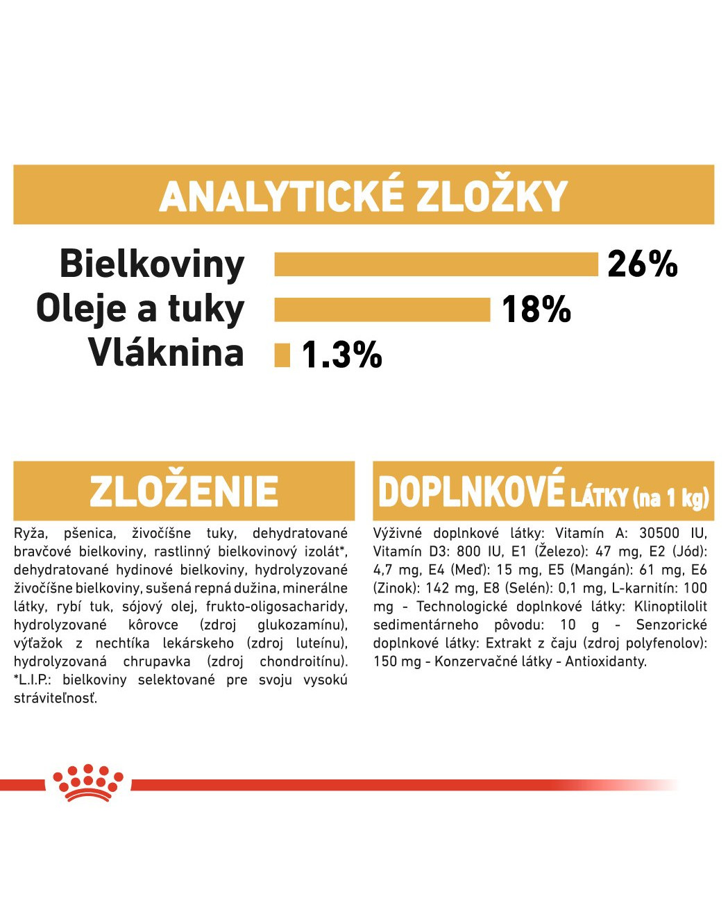 Zloženie: Ryža, pšenica, živočíšne tuky, dehydratované bravčové mäso, izolát rastlinného proteínu (L.I.P. proteín vybraný vďaka svojej vysokej stráviteľnosti), dehydratované hydinové mäso, hydrolyzované živočíšne proteíny, repné odrezky, minerály, rybí olej, sójový olej, fruktooligosacharidy, hydrolyzované kôrovce (zdroj glukozamínu), výťažok z nechtíka lekárskeho (zdroj luteínu), hydrolyzované chrupavky (zdroj chondroitínu).