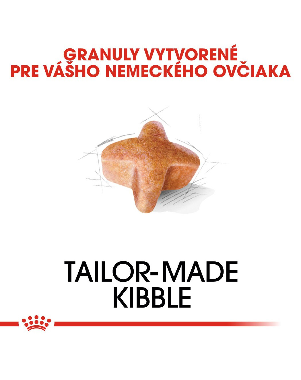Granula krmiva ROYAL CANIN® German Shepherd Adult má unikátnu veľkosť a tvar, ktorý je prispôsobený čeľusti nemeckého ovčiaka. Táto granula je špeciálne navrhnutá tak, aby psa donútila dôkladne hrýzť a zároveň zvyšovala jeho chutnosť.