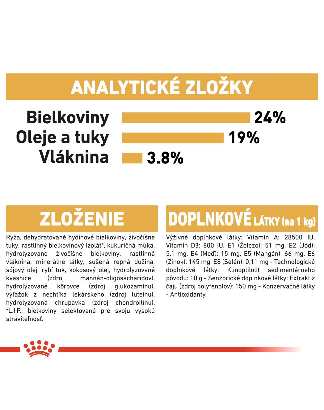 Zloženie: Ryža, dehydratované hydinové mäso, živočíšne tuky, izolát rastlinného proteínu ((L.I.P. – proteín vybraný vďaka svojej vysokej stráviteľnosti), kukuričná múka, hydrolyzované živočíšne proteíny, rastlinná vláknina, minerály, repné odrezky, sójový olej, rybí olej, kokosový olej, hydrolyzované kvasnice (zdroj mannooligosacharidov), hydrolyzované kôrovce (zdroj glukozamínu), výťažok z nechtíka lekárskeho (zdroj luteínu), hydrolyzované chrupavky (zdroj chondroitínu).