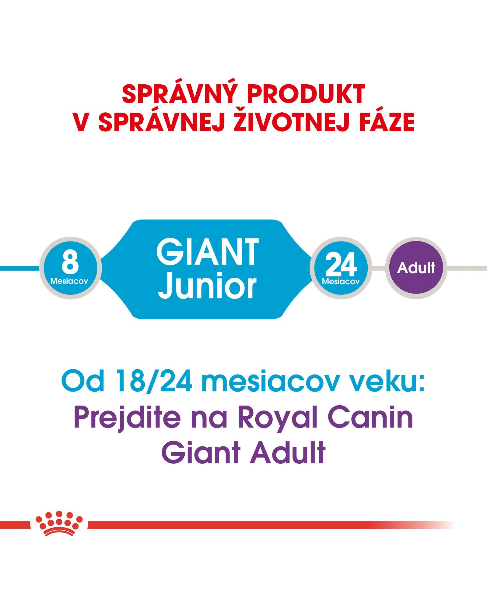 Rast je najdôležitejšou fázou v živote vášho psa: je to obdobie veľkých zmien, objavov. Počas tohto kľúčového obdobia rastu a vývoja je správna výživa obzvlášť dôležitá. Krmivo ROYAL CANIN® Giant Junior je vytvorené tak, aby uspokojilo všetky nutričné potreby vášho veľkého šteňaťa. Krmivo je vhodné pre šteňatá obrích plemien od 8 do 18/24 mesiacov, ktoré v dospelosti dosiahnu hmotnosť nad 45 kg.