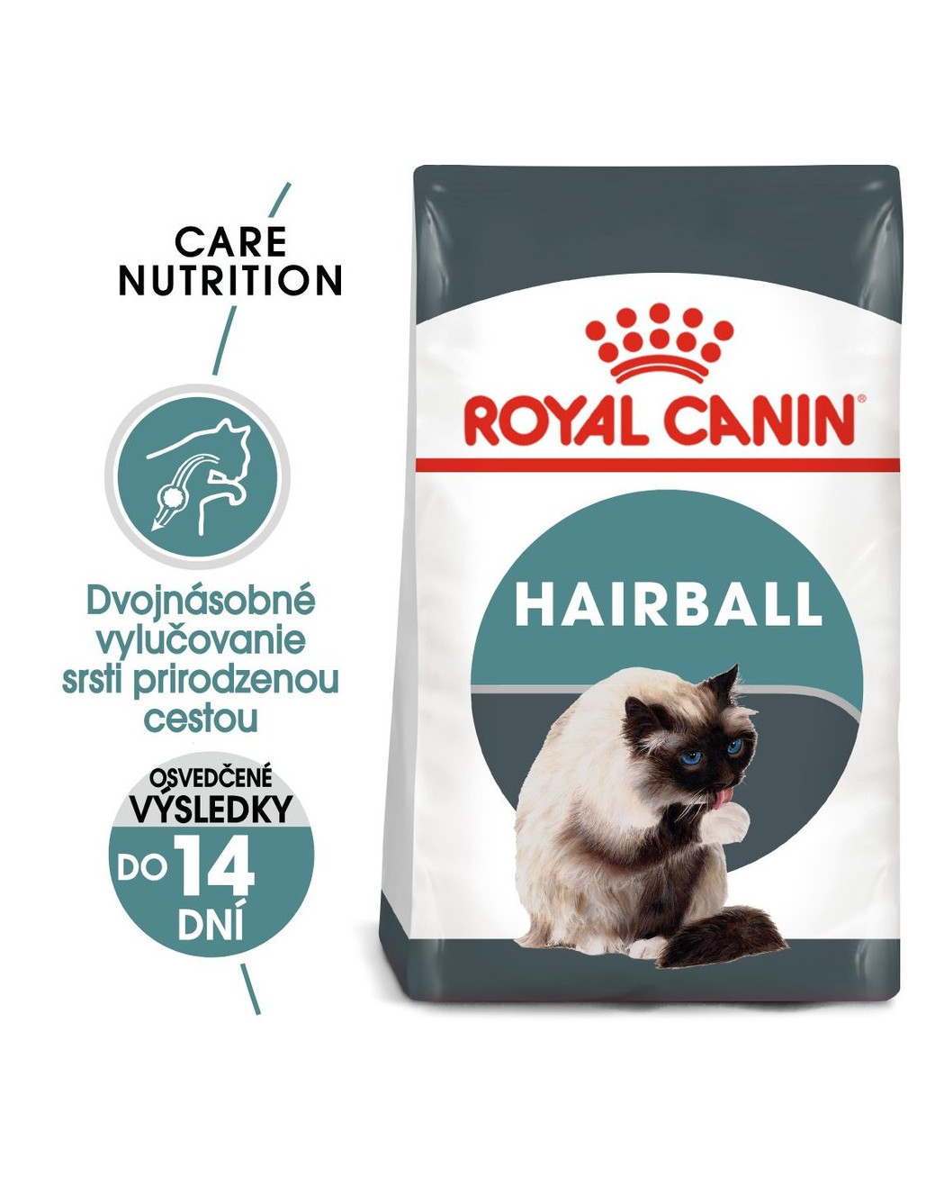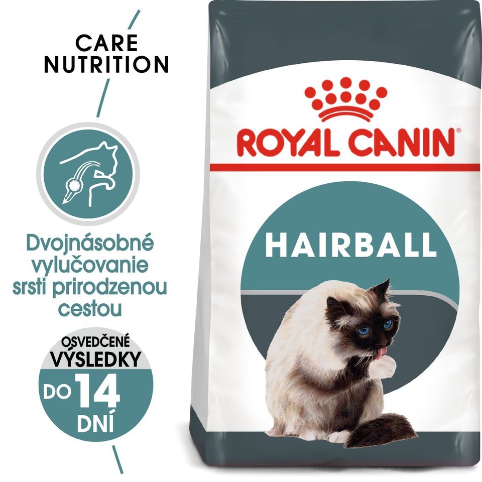 Zloženie krmiva ROYAL CANIN® Hairball Care sa skladá zo špecifickej zmesi vláknin, vrátane psyllia (bohatého na sliz) a nerozpustnej vlákniny, ktorá prirodzene stimuluje zdravé pohyby čriev. Pohltané chlpy tak môžu byť každý deň vylúčené stolicou a nehromadia sa v žalúdku, kde čakajú na vyvrátenie. Krmivo taktiež obsahuje presne vyváženú kombináciu živín, vysoký obsah bielkovín a tuku.