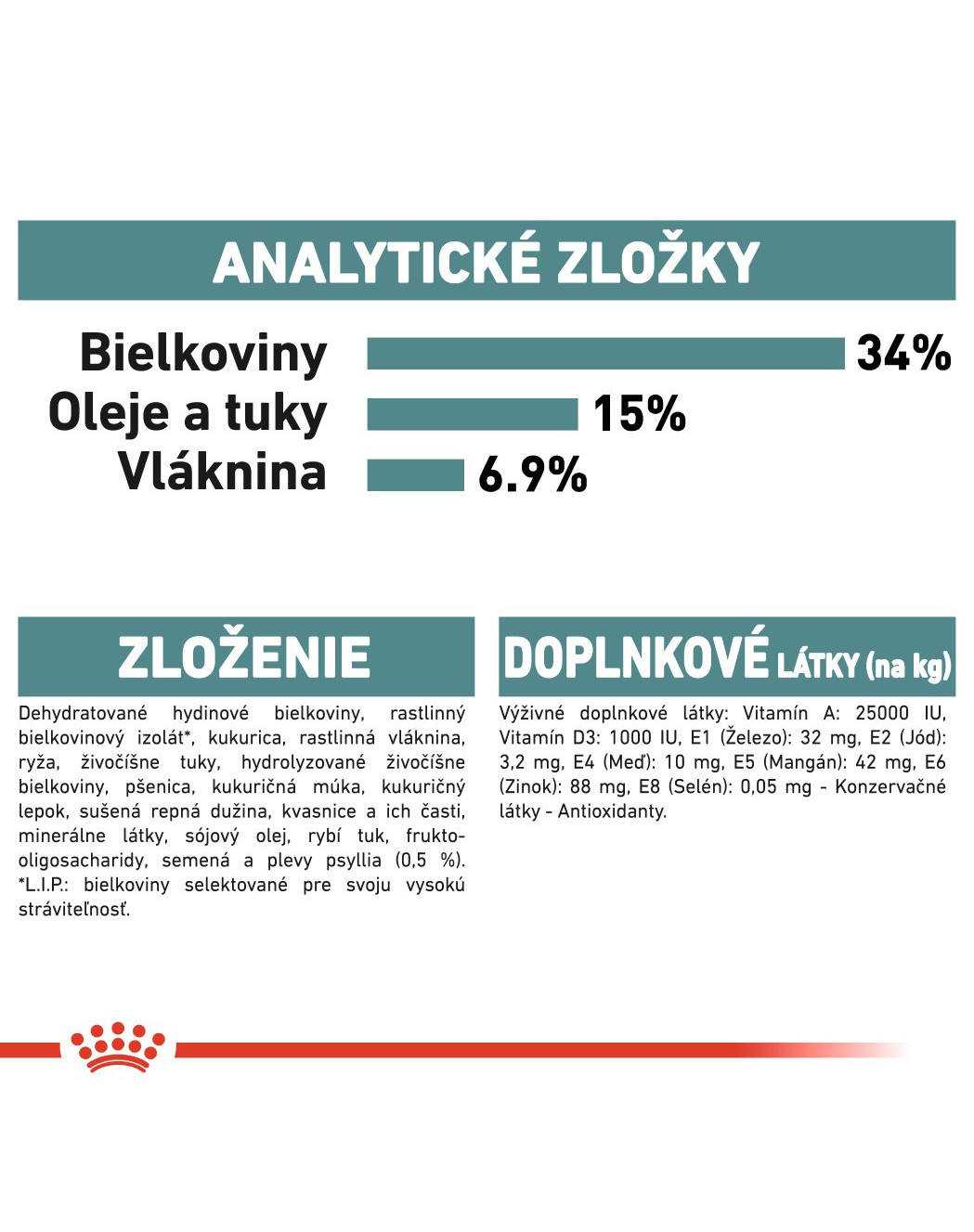 Zloženie: Dehydratované hydinové mäso, izolát rastlinného proteínu (L.I.P. – bielkovina pridávaná pre svoju ľahkú stráviteľnosť), kukurica, rastlinná vláknina, ryža, živočíšne tuky, hydrolyzované živočíšne proteíny, pšenica, kukuričná múka, kukuričný lepok, repné odrezky, kvasnice, minerály, sójový olej, rybí olej, fruktooligosacharidy, šupky a semená psyllia (0,5 %).