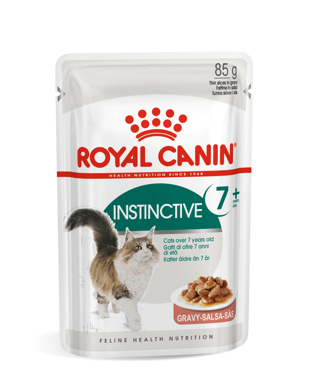 Mačky staršie ako 7 rokov môžu vykazovať výkyvy v chuti do jedla a môžu byť viac vyberavé. Súvisí to so slabšou funkciou čuchového epitelu. Royal Canin Instinctive+7 sa dodáva vo forme jemných kúskov v omáčke, aby uspokojil potreby aj tých najvyberavejších domácich zvierat.