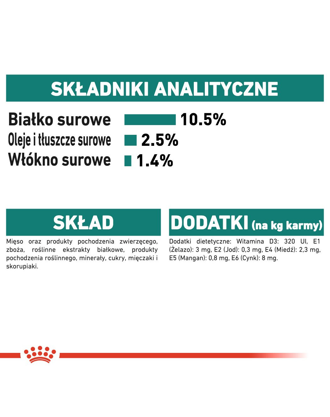 Bravčové a kuracie mäso, bravčová pečeň, ryžová múka, kuracia pečeň, pšeničné bielkoviny, celulóza, cukry, minerálne soli, aminokyseliny, rybí olej, zahusťovadlá, hydrolyzované kôrovce, múčka z aksamietnice, vitamíny