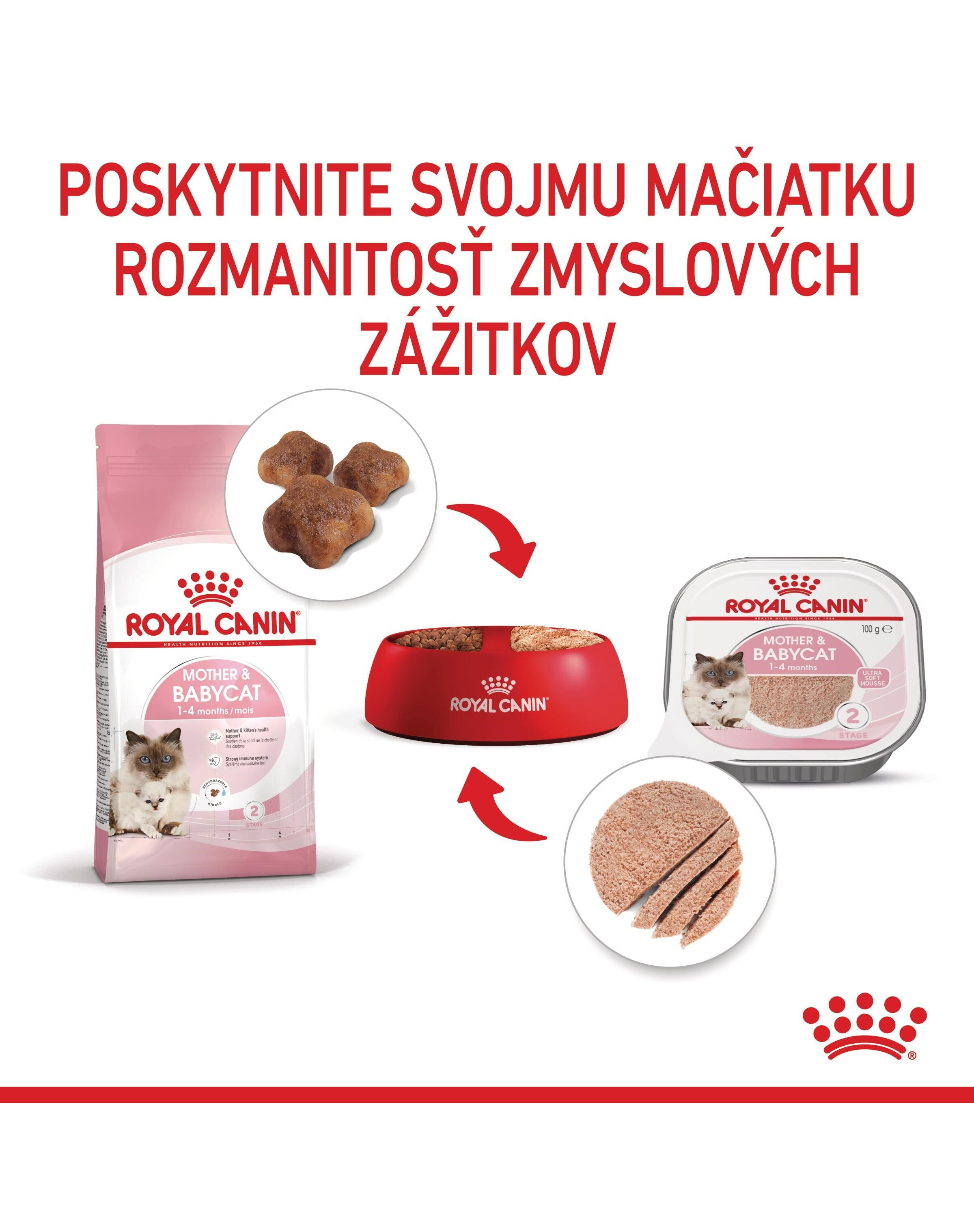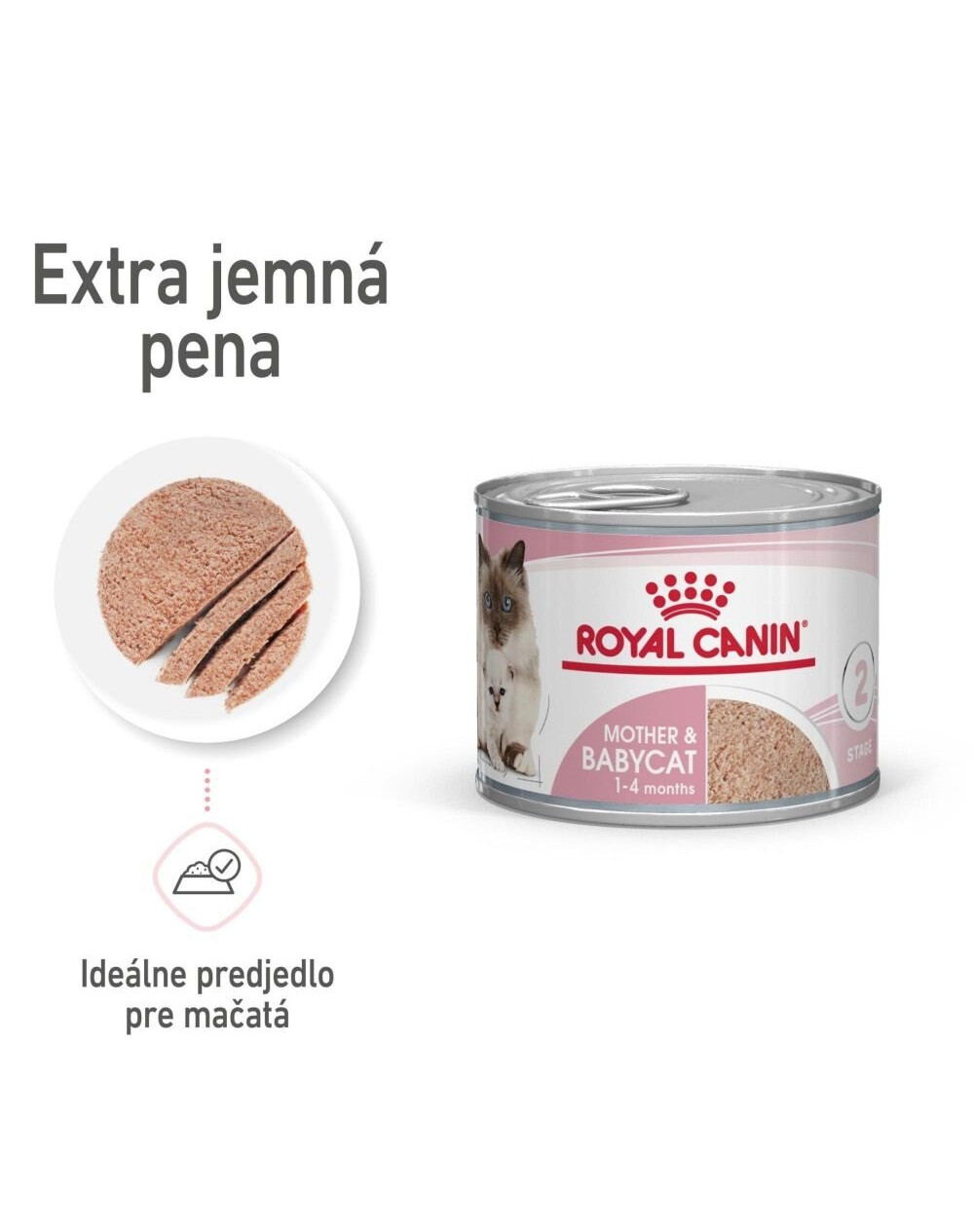 Počas prvých 3 týždňov sa mačiatka spoliehajú na materské mlieko. Odvtedy začnú odstavené mačiatka prechádzať na olizovanie a žuvanie toho, čo ich matka jej. Z tohto dôvodu je dobré kŕmiť gravidné a dojčiace matky výživnou stravou, ktorá je prispôsobená tak, aby vyhovovala jej jedinečným nutričným potrebám a potrebám jej mačiatok. Pena ROYAL CANIN Mother & Babycat Ultra Soft Mousse je špeciálne upravená tak, aby vyhovovala vysokým energetickým potrebám vašej mačky na konci gravidity a počas laktácie. Je tiež formulovaná tak, aby mala chutnú, mäkkú textúru, ktorá je ideálna pre dojčiace mačiatka do 4 mesiacov. Novonarodené mačiatka dostávajú ochranné protilátky z mledziva svojej matky, ale táto ochrana časom slabne. ROYAL CANIN Mother & Babycat Ultra Soft Mousse obsahuje osvedčený komplex vrátane vitamínov C a E na podporu zdravého vývoja imunitného systému. Táto receptúra je obohatená o omega-3 mastné kyseliny (DHA) na podporu vývoja mozgu a zdravého zraku u malých mačiatok.