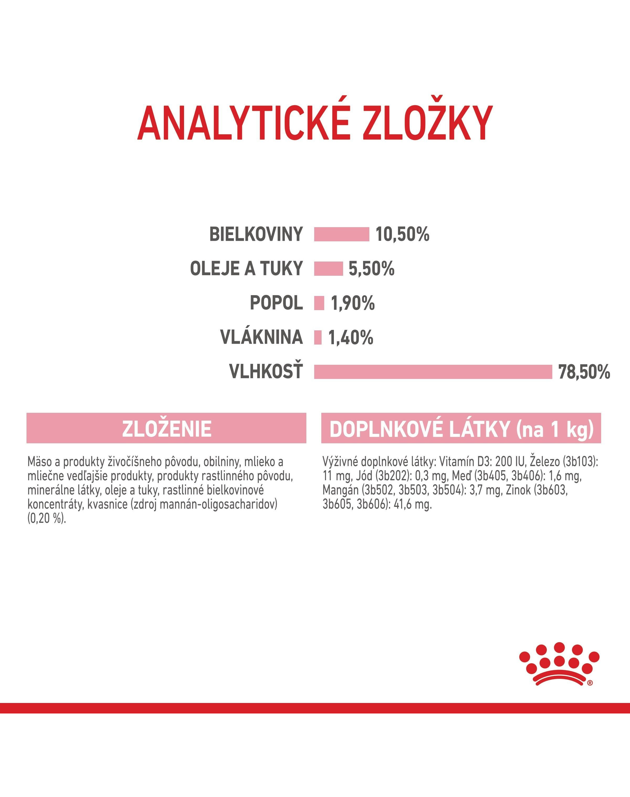 ANALYTICKÉ ZLOŽKY:BIELKOVINY 10,5 %, OLEJE A TUKY 5,5 %, POPOL 1,7 %, VLÁKNINA 0,8 %, VLHKOSŤ 78,7 %