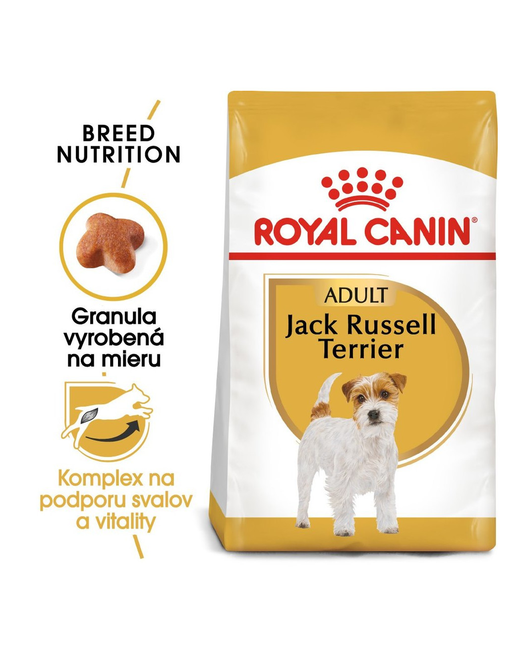 Royal Canin Jack Russell Terrier Adult je kompletné superprémiové krmivo pre dospelé (od 10 mesiacov veku) čistokrvné plemeno Jack Russell teriéra. Kompletné krmivo Jack Russell Terrier, navrhnuté priamo na mieru tomuto aktívnemu plemenu, sa vyznačuje špeciálnou receptúrou. Vďaka upravenému prísunu bielkovín, energie, vápnika a fosforu udržuje svalovú hmotu a podporuje harmonický rast, vitalita psov je udržovaná pomocou komplexu antioxidantov. Zloženie granúl obohatené o EPA & DHA a borákový olej pomáha posilniť funkciu kože ako bariéry a udržuje zdravie kože a srsti. Redukciu vzniku zubného kameňa zaisťujú chelátory vápnika.