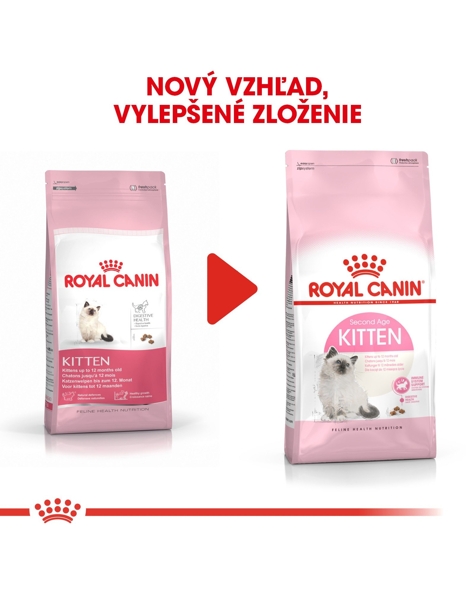 Druhá fáza rastu je pre vaše mačiatko kľúčová, pretože jeho imunitný systém sa stále postupne vyvíja. Krmivo ROYAL CANIN® Kitten podporuje prirodzenú obranyschopnosť vášho mačiatka hlavne vďaka patentovanému komplexu antioxidantov, do ktorého patrí aj veľmi prospešný vitamín E. Pretože je tráviaci systém vášho mačiatka v citlivej fáze vývoja, krmivo je ľahko stráviteľné vďaka bielkovinám, ktoré sú stráviteľné minimálne z 90 % (označované anglickou skratkou L.I.P.) a probiotikám, napríklad FOS. Rast vášho mačiatka je v tomto období pomerne intenzívny. Granule obsahujú upravený obsah bielkovín a vyrovnaný obsah vitamínov a minerálov, napríklad vitamínu D a vápnika. Vysoký energetický obsah presne zodpovedá zvýšenej aktivite vášho mačiatka.
