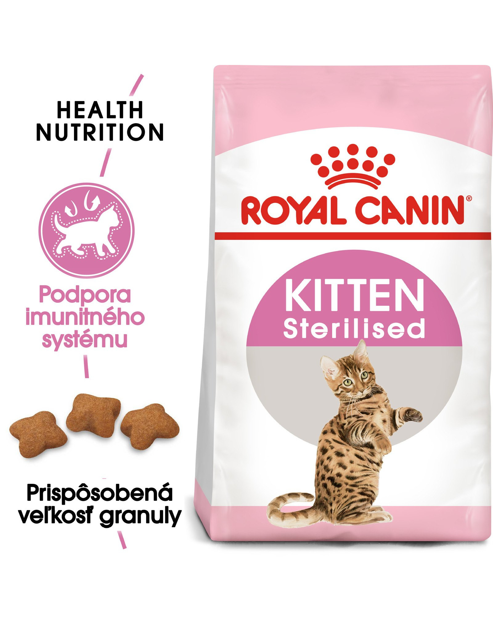 Krmivo poskytuje vašej mačke špeciálnu kombináciu vitamínov, minerálov a patentovaný komplex antioxidantov, ktorý podporuje obranyschopnosť vášho mačiatka, keď rastie na silnú dospelú mačku. Kastrované mačiatka majú tendenciu prijímať viac potravy, hlavne z dôvodu dlhšieho spánku, čo vedie k zníženej telesnej aktivite. Preto krmivo ROYAL CANIN® Kitten Sterilised obsahuje nižšie množstvo tuku, vďaka čomu je ľahšie udržať si ideálnu hmotnosť, a vhodný obsah bielkovín, vápnika a fosforu pre zdravý rast.