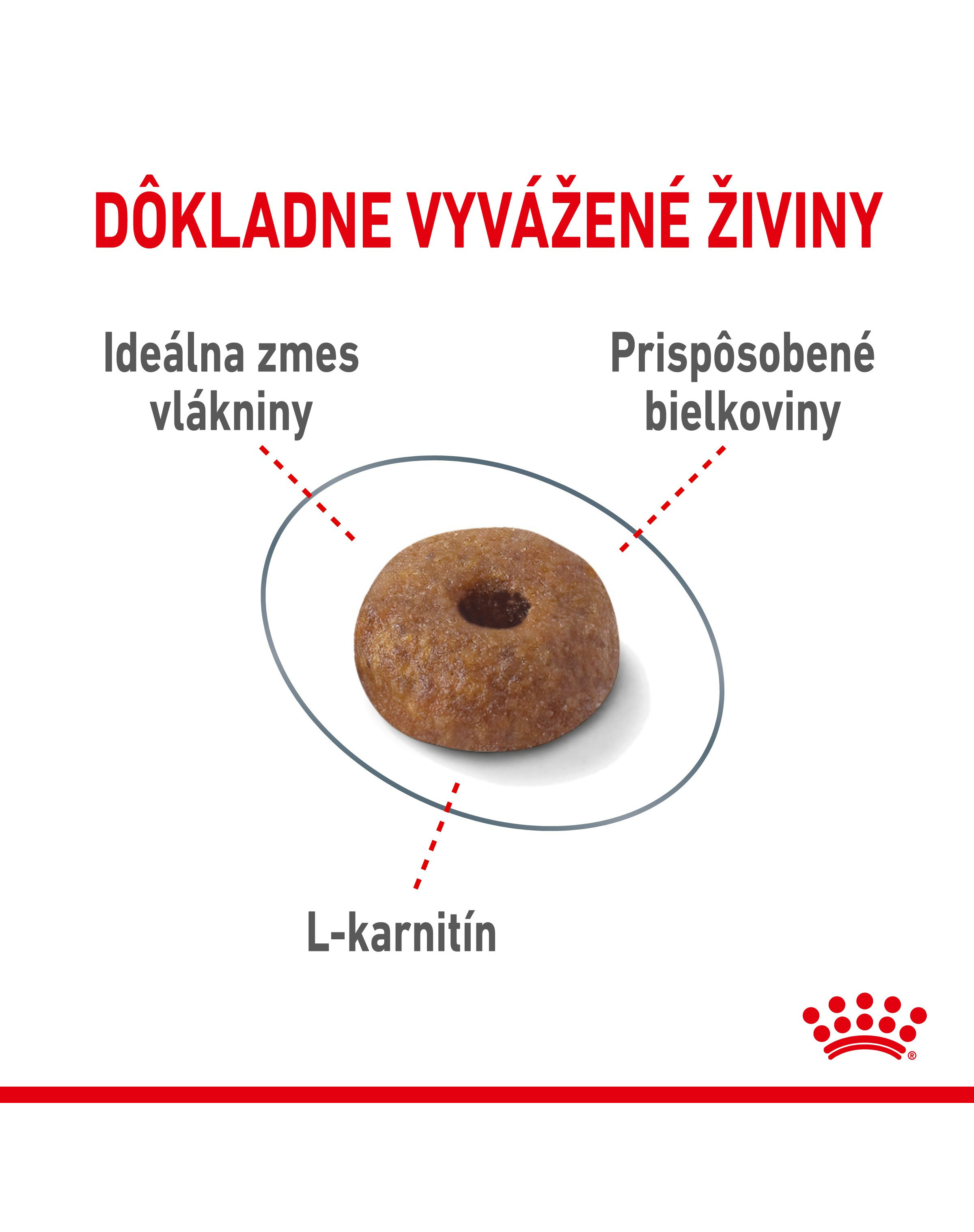 Krmivo ROYAL CANIN® Weight Care má presne vyvážené zloženie, ktoré pomáha vašej mačke udržiavať si zdravú kondíciu. Obsahuje špeciálnu zmes vláknin (vrátane psyllia), ktorá zväčšuje objem potravy v žalúdku a vyvoláva pocit sýtosti, čím obmedzuje spontánny príjem potravy. Zloženie krmiva je obohatené o L-karnitín, ktorý sa zúčastňuje zdravého metabolizmu tukov. Obsahuje vysoký obsah bielkovín a nízky obsah tukov, ideálny pomer, aby bola zachovaná svalová hmota, ale obmedzené priberanie na hmotnosti. Kvalitnú výživu spojte s pravidelným kŕmením a cvičením prispôsobeným veľkosti vašej mačky.