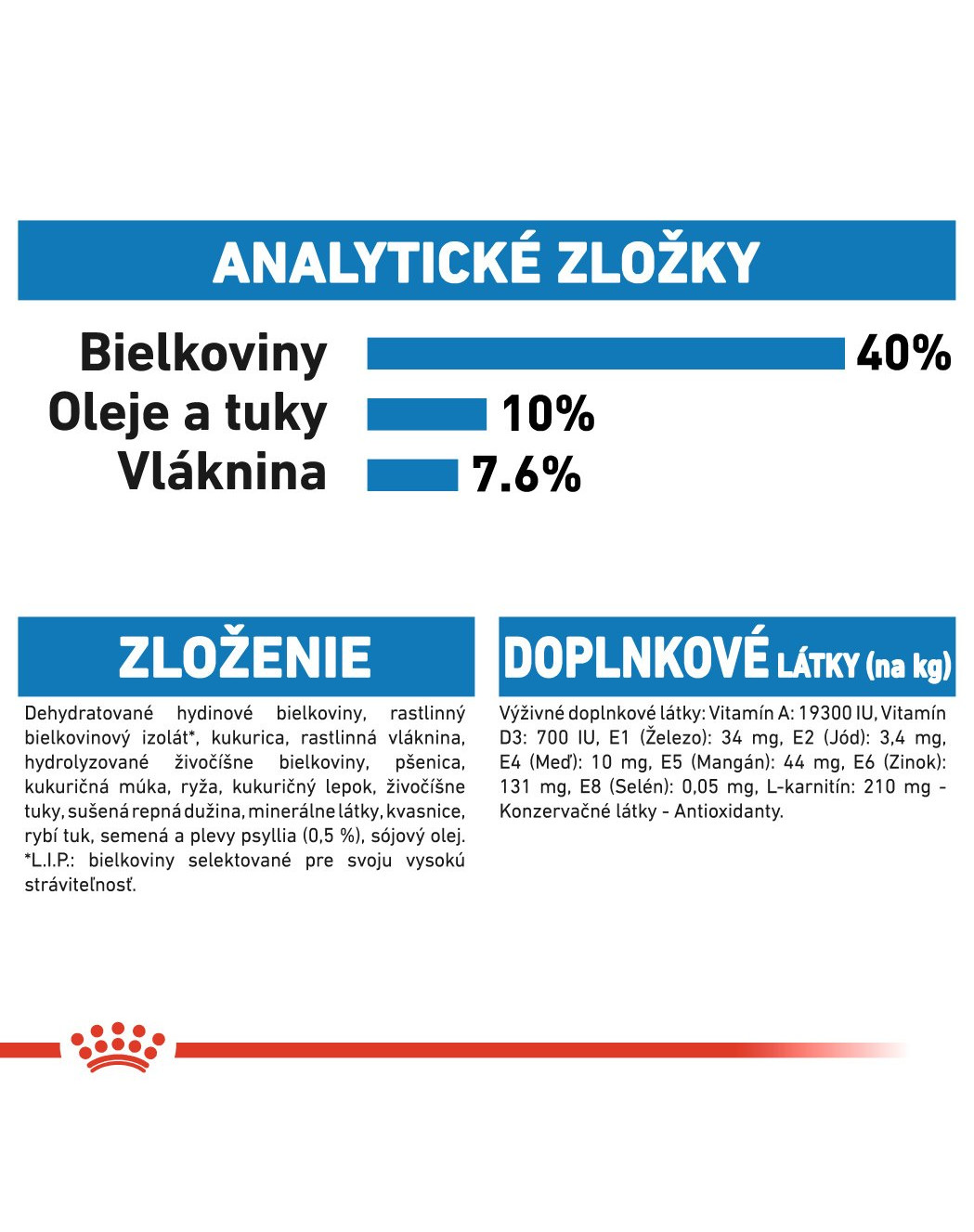 Zloženie: Dehydratované hydinové mäso, izolát rastlinného proteínu (L.I.P. – bielkovina pridávaná pre svoju ľahkú stráviteľnosť), kukurica, rastlinná vláknina, hydrolyzované živočíšne proteíny, pšenica, kukuričná múka, ryža, kukuričný lepok, živočíšne tuky, repné odrezky, minerály, kvasnice, rybí olej, šupky a semená psyllia (0,5 %), sójový olej.