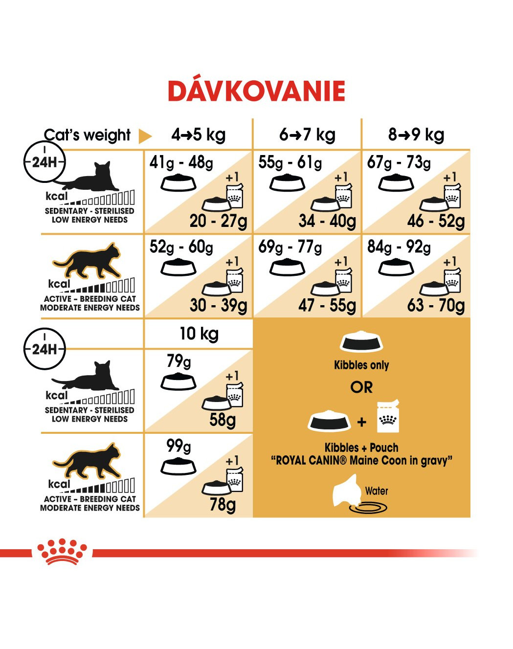 Vyhovieť individuálnym preferenciám každej mačky, ROYAL CANIN Maine Coon Adult je tiež k dispozícii ako vlhké krmivo v lahodnej omáčke. Pokiaľ uvažujete o kombinovanom kŕmení, jednoducho dodržujte našu dávkovaciu tabuľku, aby ste zaistili, že vaša mačka dostane presné množstvo vlhkého aj suchého krmiva pre maximálny prínos.