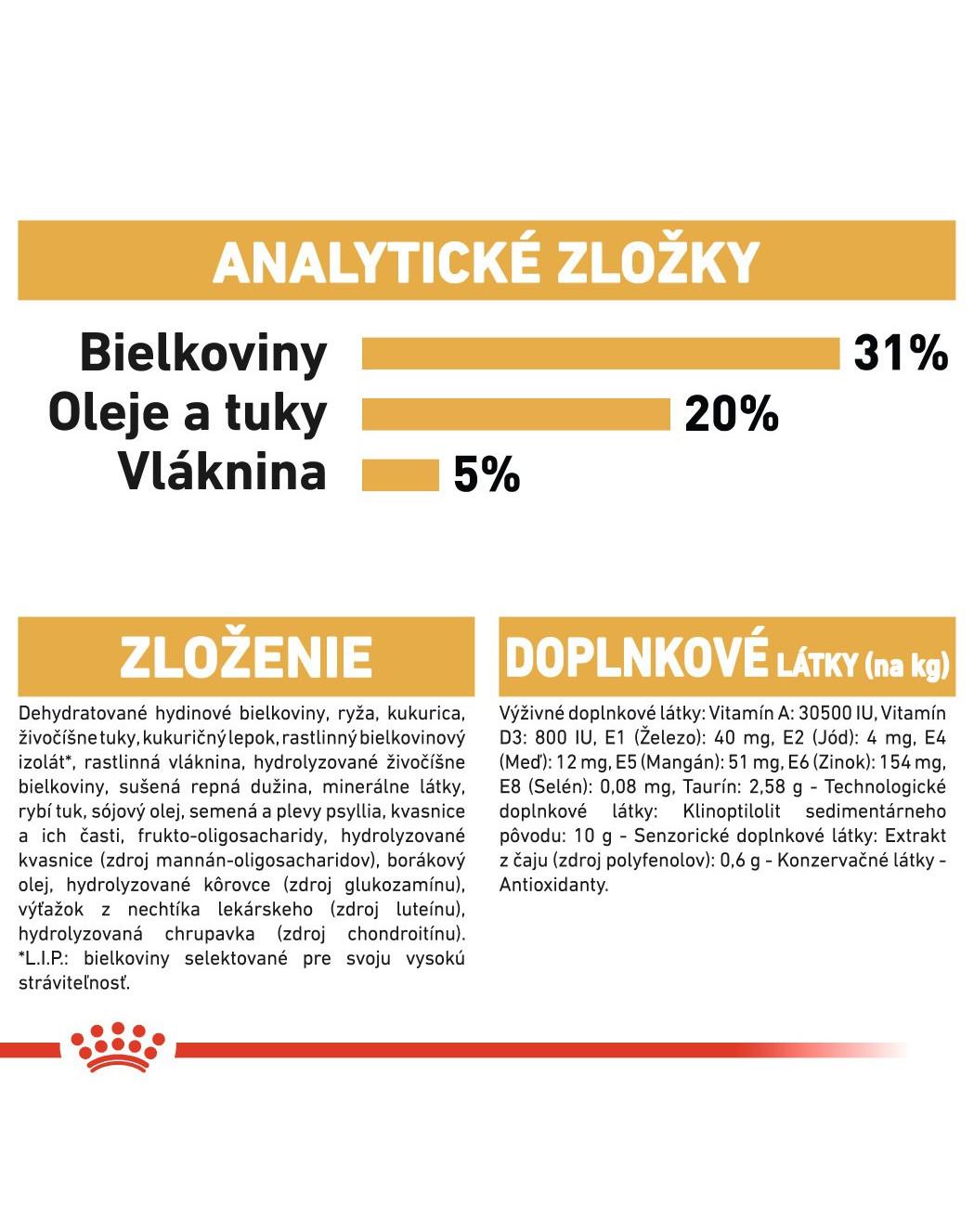 *L.I.P.: proteíny vybrané pre svoju veľmi vysokú stráviteľnosťVitamín A: 30500 IU, Vitamín D3: 800 IU, E1 (železo): 40 mg, E2 (jód): 4 mg, E4 (meď): 12 mg, E5 (mangán): 51 mg, E6 (zinok): 154 mg, E8 (selén): 0,08 mg, taurín: 2,58 g. Technologické doplnkové látky: klinoptilolit sedimentárneho pôvodu: 10 g. Senzorické doplnkové látky: čajový extrakt (zdroj polyfenolov): 0,6 g. Konzervačné látky. Antioxidanty.