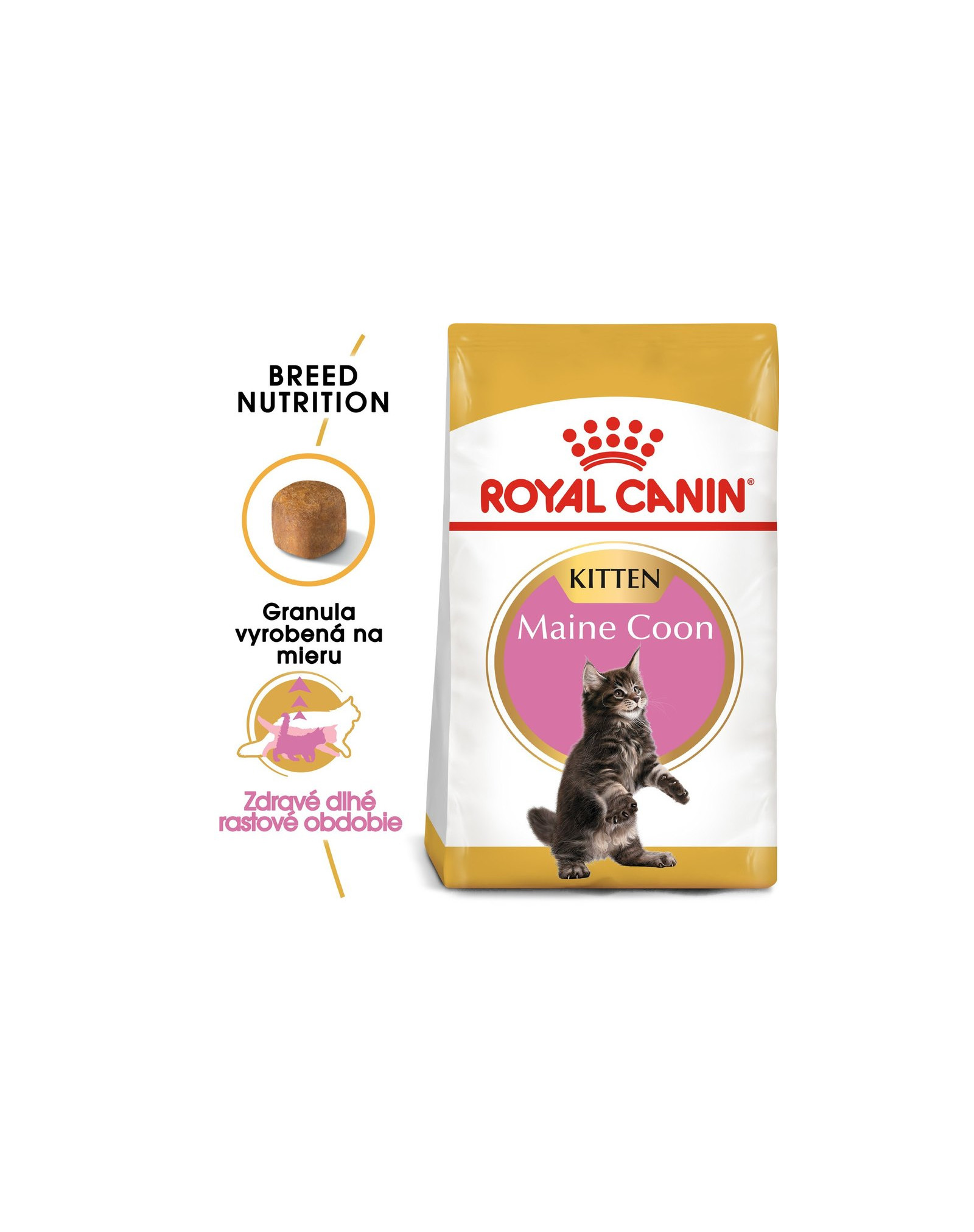 Royal Canin Maine Coon Kitten je kompletné superprémiové krmivo pre Mainské mývalie mačiatka do 15 mesiacov veku a gravidné alebo dojčiace mačky.Pretože rast mainských mývalích mačiatok trvá dlhšie, treba im ranú výživu dopriať v dostatočnej miere, pozor ale na prekrmovanie. Toto krmivo prispieva k správnemu vývoju kostí a kĺbov mačiatka vďaka prispôsobenému obsahu energie, vápnika, fosforu a vitamínu D. Vysoko stráviteľné proteíny L.I.P. a komplex antioxidantov sú nevyhnutné pre harmonický a zdravý vývoj mačiatka. Extra veľká granula „Malachite 9“ pomôže, aby sa mláďatám dobre hrýzla a udržiavali si zdravú zubnú hygienu.
