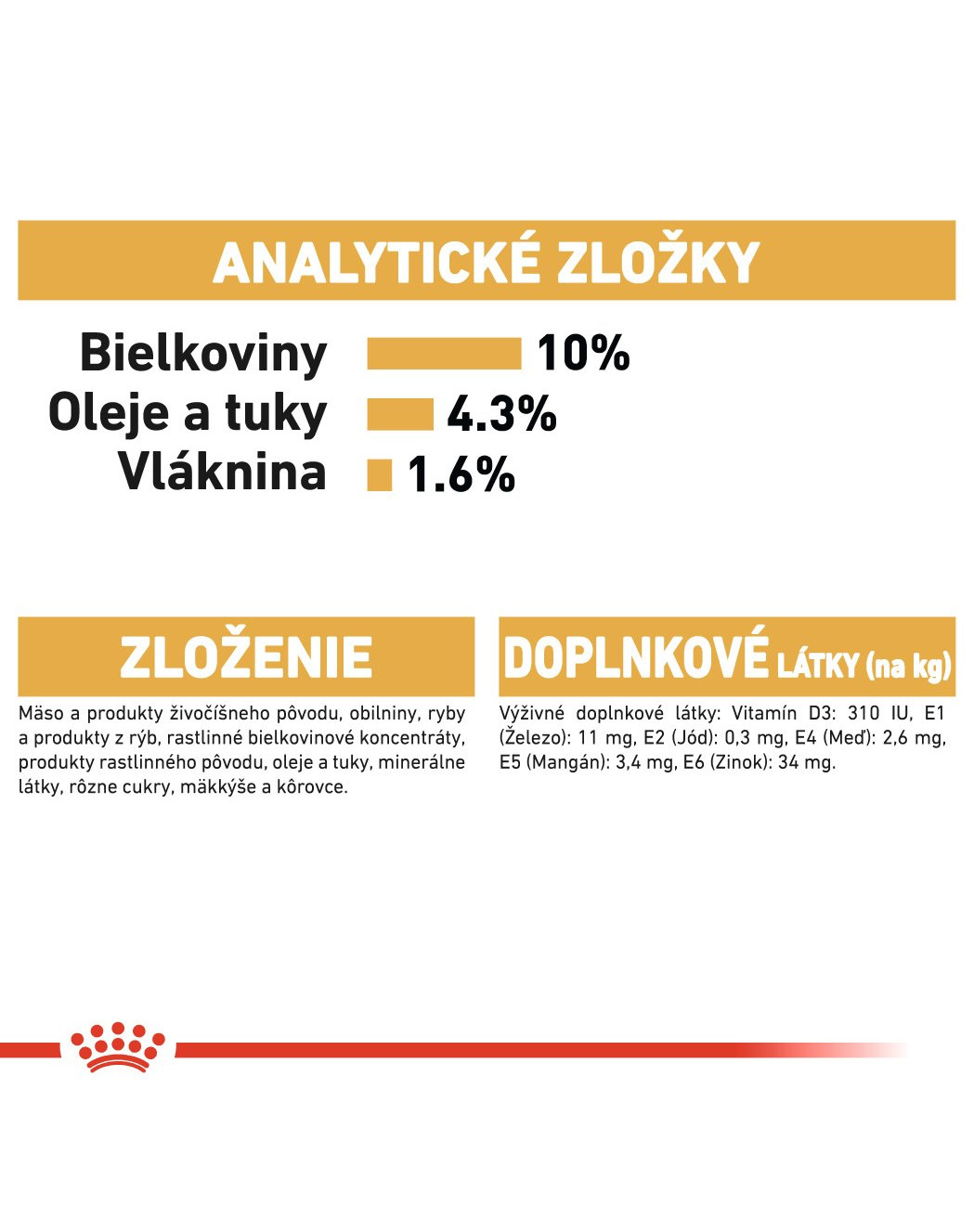 Zloženie: Mastné a živočíšne deriváty, obilniny, ryby a rybie deriváty, výťažky z rastlinných proteínov, oleje a tuky, deriváty rastlinného pôvodu, minerály, cukry, mäkkýše a kôrovce.
