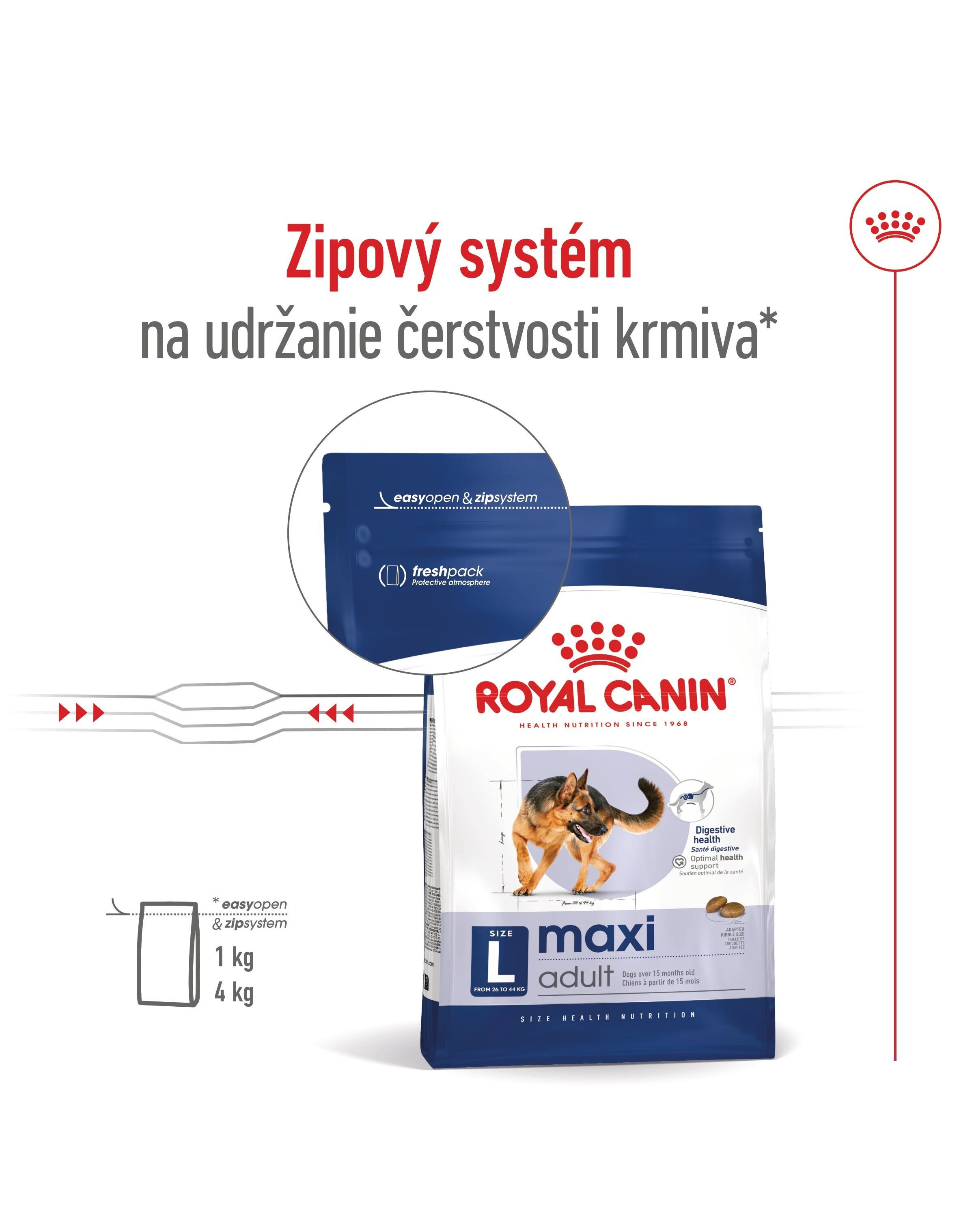 Veľké psy sa môžu pochváliť osobnosťou rovnako veľkolepú ako ich postava. Verný, robustný a energický, pripravte sa na nekonečné hranie a vonkajšie eskapády so svojim veľkým spoločníkom. To však znamená, že potrebujú stravu prispôsobenú konkrétnej veľkosti, ktorá pomôže podporiť ich jedinečné nutričné požiadavky. ROYAL CANIN Maxi Adult je nutrične kompletná a vyvážená receptúra špeciálne navrhnutá tak, aby spĺňala špecifické potreby vášho veľkého psa a podporovala ho po celú dobu jeho dospelosti. Toto krmivo je určené pre veľké psy, ktoré vážia medzi 26 a 44 kg a sú staršie ako 15 mesiacov. Väčšie psy s predĺženou dobou prechodu tráviacim traktom sú v porovnaní s menšími plemenami náchylnejšie k zažívacím problémom. Tieto granule obsahujú vysoko stráviteľné bielkoviny a vyvážený prísun vlákniny, ktorá pomáha podporovať dobré zdravie tráviaceho traktu. Väčšie psy sú náchylnejšie na zažívacie ťažkosti. Tieto granule obsahujú vysoko stráviteľné bielkoviny a vyvážený prísun vlákniny, ktorá pomáha podporovať dobré zdravie tráviaceho traktu. Či už pracujú alebo sa hrajú, väčšie psy prenášajú väčšinu svojej telesnej hmotnosti na kĺby. Táto receptúra je špeciálne vytvorená s kombináciou minerálov a živín, ktoré pomáhajú podporovať zdravé kosti a kĺby. Toto krmivo, ktoré je prispôsobené jedinečným potrebám vášho veľkého psa, je vyrobené zo zmesi vitamínov a vysoko kvalitných živín na maximálne vstrebávanie a podporu celkového zdravia. Vzhľadom na odlišnú štruktúru čeľustí väčších plemien sú naše granule vďaka svojej jedinečnej veľkosti a tvaru prispôsobené čeľusti vášho psa a pomáhajú mu správne žuť potravu.
