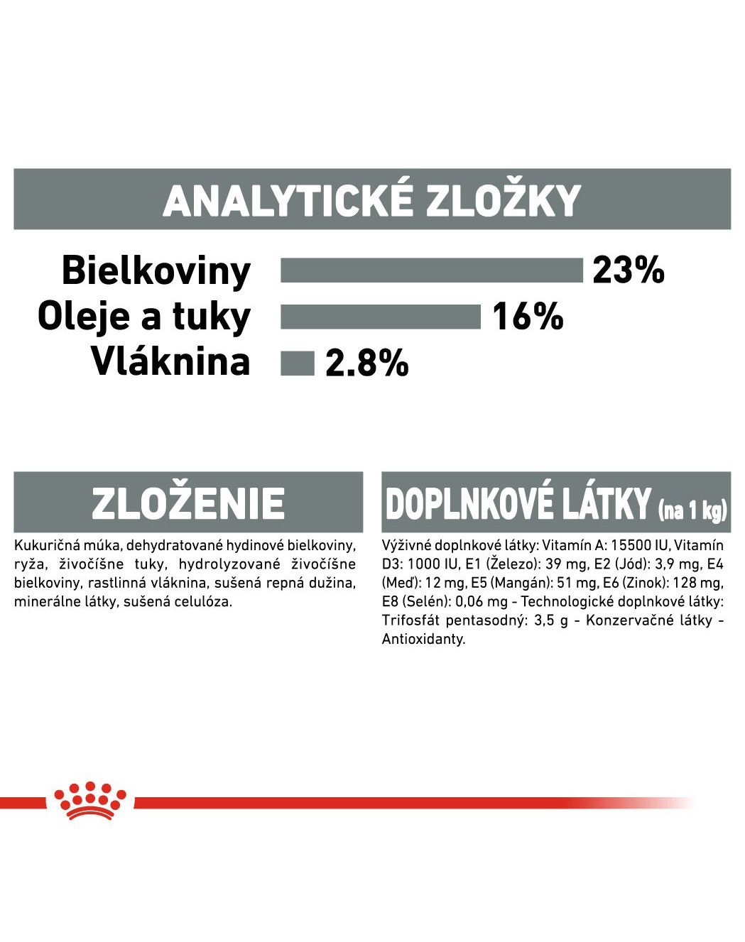 Výživové doplnkové látky: Vitamín A: 15500 NE. Vitamín D3: 1000 NE, E1 (Železo): 39 mg. E2 (Jód): 3,9 mg. E4 (Meď): 12 mg. E5 (Mangán): 51 mg. E6 (Zinok): 128 mg. E8 (Selén): 0,06 mg. - Technologické prísady: Klinoptilolit sedimentárneho pôvodu 10 g. Pentanatriumtrifosfát: 3,5 g. - Konzervanty - Antioxidanty.
