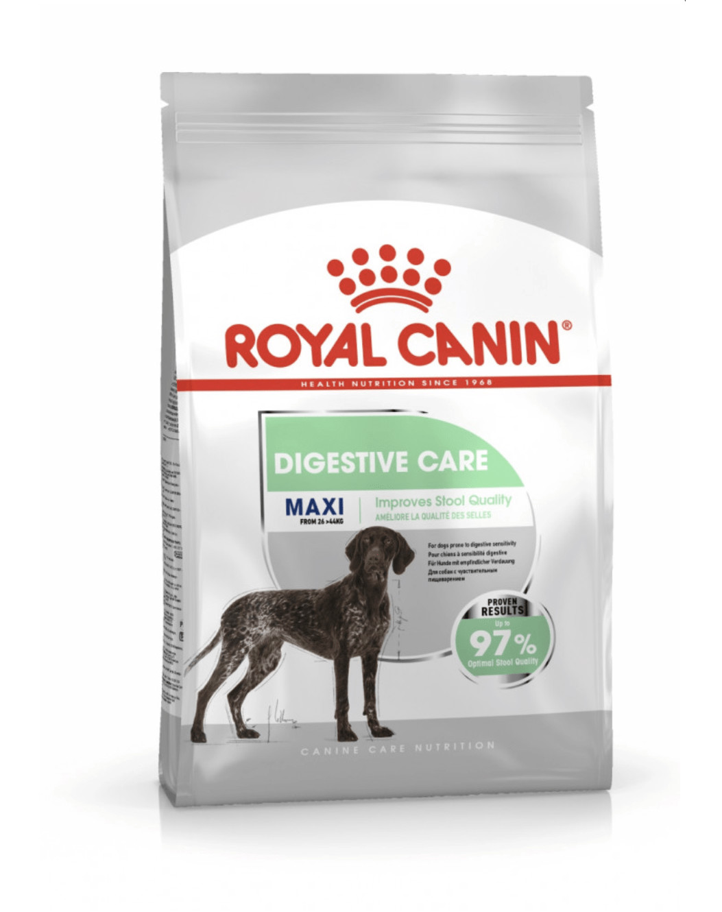 Krmivo ROYAL CANIN® Digestive Care Maxi je vhodné pre psy s hmotnosťou od 26 do 44 kg, ktoré sú náchylné na citlivé trávenie. Vzhľadom na to, že väčšie psy sú náchylnejšie na fermentáciu v črevách, mäkká stolica môže byť ich veľmi častým problémom. Granuly pre psy obsahujú vysokokvalitné živiny, ktorých vyváženosť zaisťuje pohodu čriev a lepšie vstrebávanie. Zloženie obsahuje zmes probiotík a vlákniny pre vyváženú črevnú mikroflóru a podporu optimálnej kvality stolice. Krmivo je špeciálne v tom, že využíva technológiu inteligentnej prípravy krmiva. Tá zabezpečuje, aby boli živiny lepšie stráviteľné. Táto vysoká stráviteľnosť je potvrdená pravidelnými a prísnymi kontrolami kvality. Probiotiká sú nevyhnutné živiny, ktoré živia dobré baktérie v črevách vášho psa. Tieto baktérie sú známe aj ako zdravá črevná mikroflóra a zohrávajú dôležitú úlohu pri podpore zdravia čriev i celkového zdravia vášho psa.