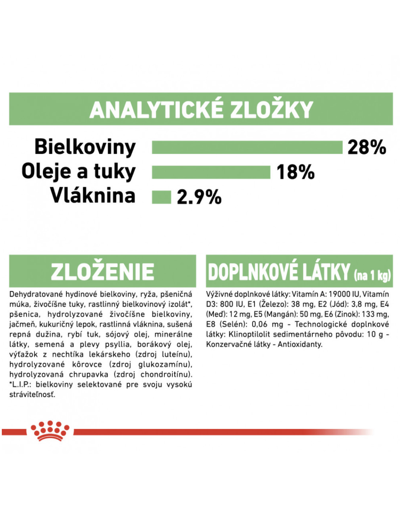 Zloženie: Dehydratované hydinové bielkoviny, ryža, pšeničná múka, živočíšne tuky, rastlinný bielkovinový izolát (L.I.P.: bielkoviny selektované pre svoju vysokú stráviteľnosť), pšenica, hydrolyzované živočíšne bielkoviny, jačmeň, kukuričný lepok, rastlinná vláknina, sušená repná dužina, rybí tuk, sójový olej, minerálne látky, semená a plevy psyllia, borákový olej, výťažok z nechtíka lekárskeho (zdroj luteínu), hydrolyzované kôrovce (zdroj glukozamínu), hydrolyzovaná chrupavka (zdroj chondroitínu).