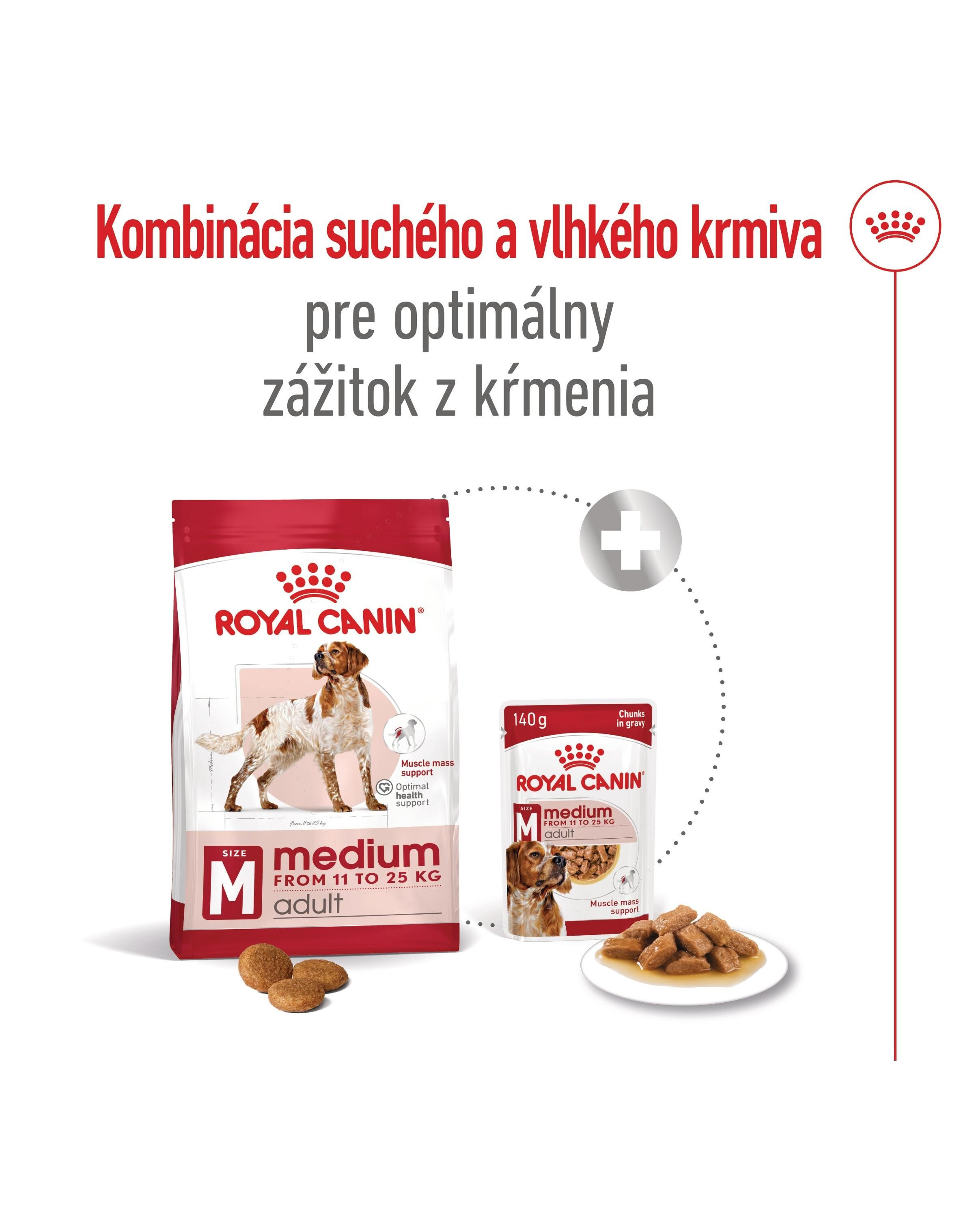 Tvar a veľkosť granúl sme prispôsobili tak, aby vyhovovali jedinečnej čeľusti vášho stredného psa a jeho stravovaciemu správaniu, čo povzbudzuje k dôkladnému žuvaniu potravy. ROYAL CANIN Medium Adult je k dispozícii aj v dvoch textúrach vlhkého jedla: paštéta a vrecko v omáčke. Kombinácia vlhkého a suchého krmiva prináša do stravy vášho psa rozmanitosť, vďaka čomu je jeho jedlo zaujímavejšie a pútavejšie. Suché granule vytvárajú mechanický kefovací efekt, ktorý pomáha udržovať zdravie zubov, zatiaľ čo obsah vlhkosti vo vlhkom krmive pomáha udržovať vášho psa hydratovaného a udržovať zdravý močový trakt. Všetky produkty ROYAL CANIN prechádzajú rozsiahlym procesom kontroly kvality, ktorý zaručuje vysoko kvalitné potraviny. Náš tím vedcov vytvára receptúry prispôsobené špecifickým nutričným potrebám vášho stredne veľkého psa s využitím vysoko kvalitných živín a udržateľnosti.