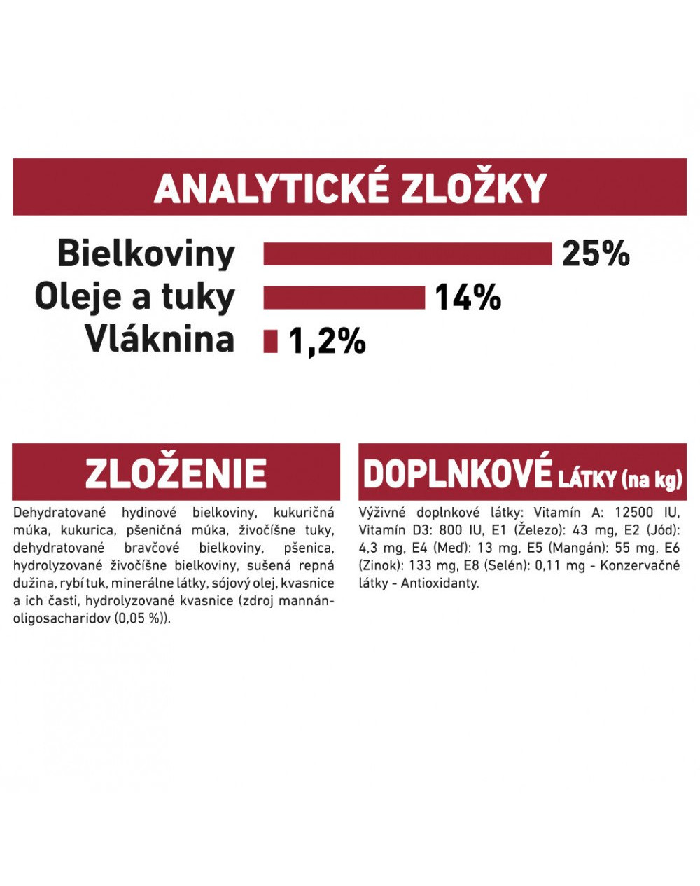 Zloženie: Dehydratované hydinové mäso, kukurica, živočíšne tuky, repné odrezky, izolát rastlinného proteínu, kukuričný lepok, dehydrované bravčové mäso (L.I.P. – proteín vybraný vďaka svojej vysokej stráviteľnosti), ryža, pšeničná múka, hydrolyzované živočíšne proteíny, pšenica, kukuričná múka, minerály, rybí olej, sójový olej, kvasnice, fruktooligosacharidy (0,34 %), hydrolyzované kvasnice (zdroj mannánoligosacharidov), výťažky z kvasníc (zdroj betaglukánov), výťažok z nechtíka lekárskeho (zdroj luteínu).