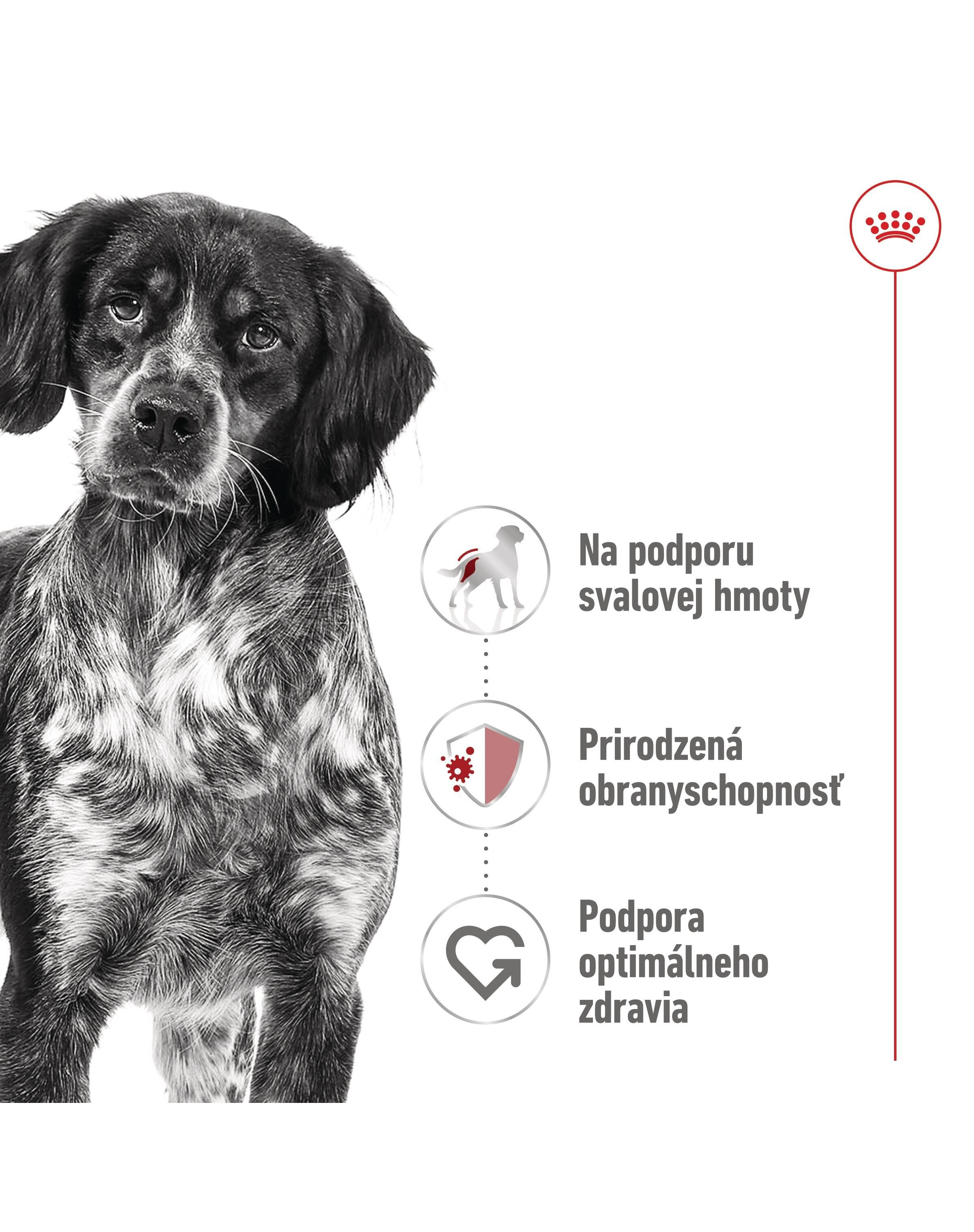 Stredne veľké psy majú flexibilnú povahu, čo znamená, že prekvitajú v aktívnom aj pokojnejšom životnom štýle. Tieto psy plnia energie nachádzajú naplnenie v činnostiach, ako sú dlhé prechádzky a pútavé hranie, pomáhajú im nasmerovať ich energiu a predchádzať nude. Mali by mať stravu prispôsobenú veľkosti, ktorá by pomohla podporiť ich celkové zdravie v tejto fáze života. ROYAL CANIN Medium Adult je nutrične kompletná a vyvážená receptúra špeciálne navrhnutá tak, aby vyhovovala konkrétnym potrebám vášho psa strednej veľkosti a podporovala ho po celú dobu jeho dospelosti. Táto strava je určená pre psy strednej veľkosti, ktorí vážia medzi 11 a 25 kg a sú staršie ako 12 mesiacov. Stredne veľké psy potrebujú dôsledné cvičenie pre správny vývoj svalov. Táto receptúra je vytvorená tak, aby pomohla udržať svalovú hmotu vďaka svojmu špecializovanému, vysoko kvalitnému obsahu bielkovín. Ich energický životný štýl vystavuje stredne veľké psy environmentálnym prvkom, ktoré môžu oslabiť ich imunitný systém. Tieto granule obsahujú prebiotiká a zmes vitamínov, vrátane vitamínov C a E, ktoré pomáhajú podporovať ich prirodzenú obranyschopnosť. Stredne dospelé psy potrebujú špecifické živiny, ktoré im pomôžu podporiť ich celkové zdravie. Táto granula obsahuje vyváženú zmes vysoko stráviteľných živín a pomáha podporovať maximálne vstrebávanie, pomáha vášmu psovi zostať zdravým a plným života.