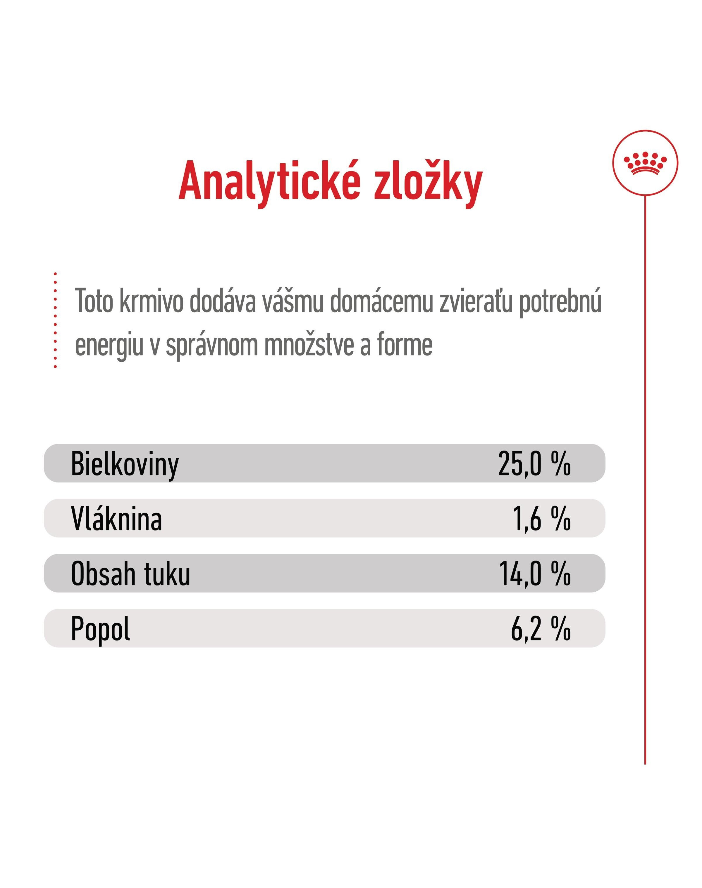 Bielkoviny: 25,0 % - Vláknina: 1,6 % - Obsah tuku: 14,0 % - Popol: 6,2 %.