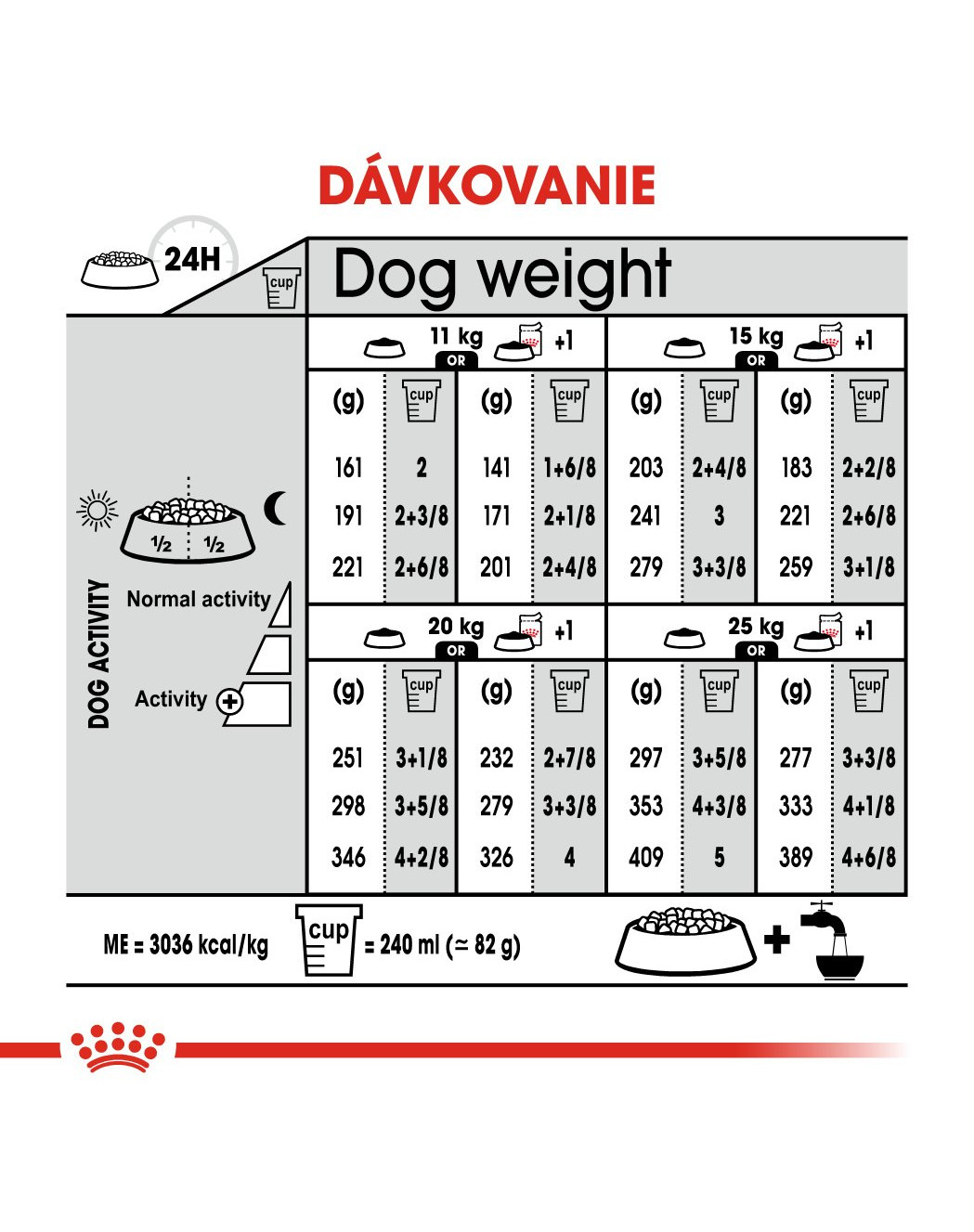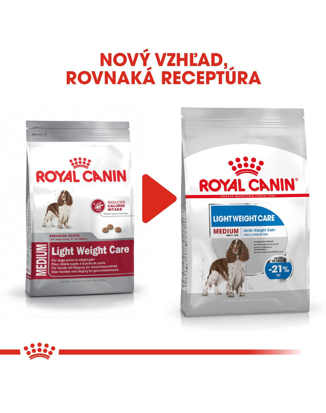 Krmivo ROYAL CANIN® Light Weight Care Medium pomáha vášmu psovi udržať ideálnu hmotnosť. Je vhodné pre psy, ktoré vážia medzi 11 a 25 kg. Toto špeciálne zloženie obsahuje skupinu mastných kyselín omega 3, vrátane EPA a DHA, ktoré podporujú kĺby. Diétne granuly pre psov sú špeciálne pripravené s nižším obsahom tukov, aby si váš pes udržiaval ideálnu telesnú hmotnosť. Spoločnosť Royal Canin vie, ako sú bielkoviny dôležité. Zloženie je bohaté na vysokostráviteľné bielkoviny, ktoré pomáhajú vášmu psovi zachovať svalovú hmotu pri zníženom príjme tukov a kalórií. Optimálna kombinácia rozpustnej a nerozpustnej vlákniny navyše vášho psa zasýti a zab