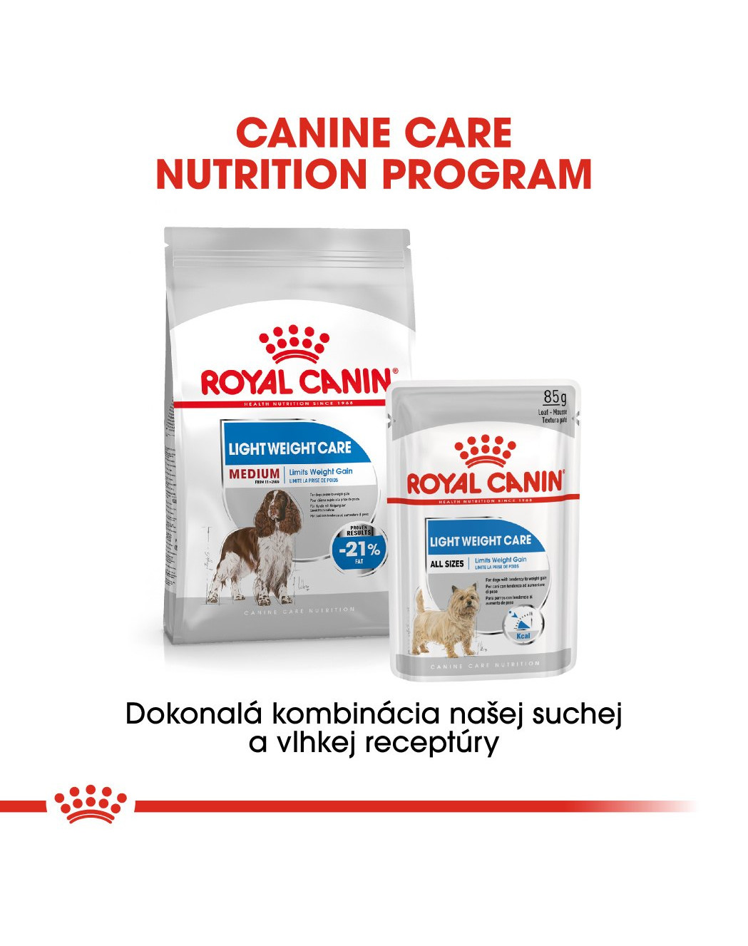 Program výživy Light Weight Care je dostupný ako chrumkavé granuly a chutné paštéty v kapsičke. Obe sú nutrične kompletné a dokonale sa dopĺňajú. Prečo nevyskúšať paštétu ako doplnok granúl? Krmivo ROYAL CANIN® Light Weight Care Medium bolo vedecky testované v pet centre Royal Canin a je dokázané, že obsahuje o 21 % menej tukov ako bežné krmivo pre dospelých psov. To znamená, že výsledky krmiva sú preukázaným úspechom.