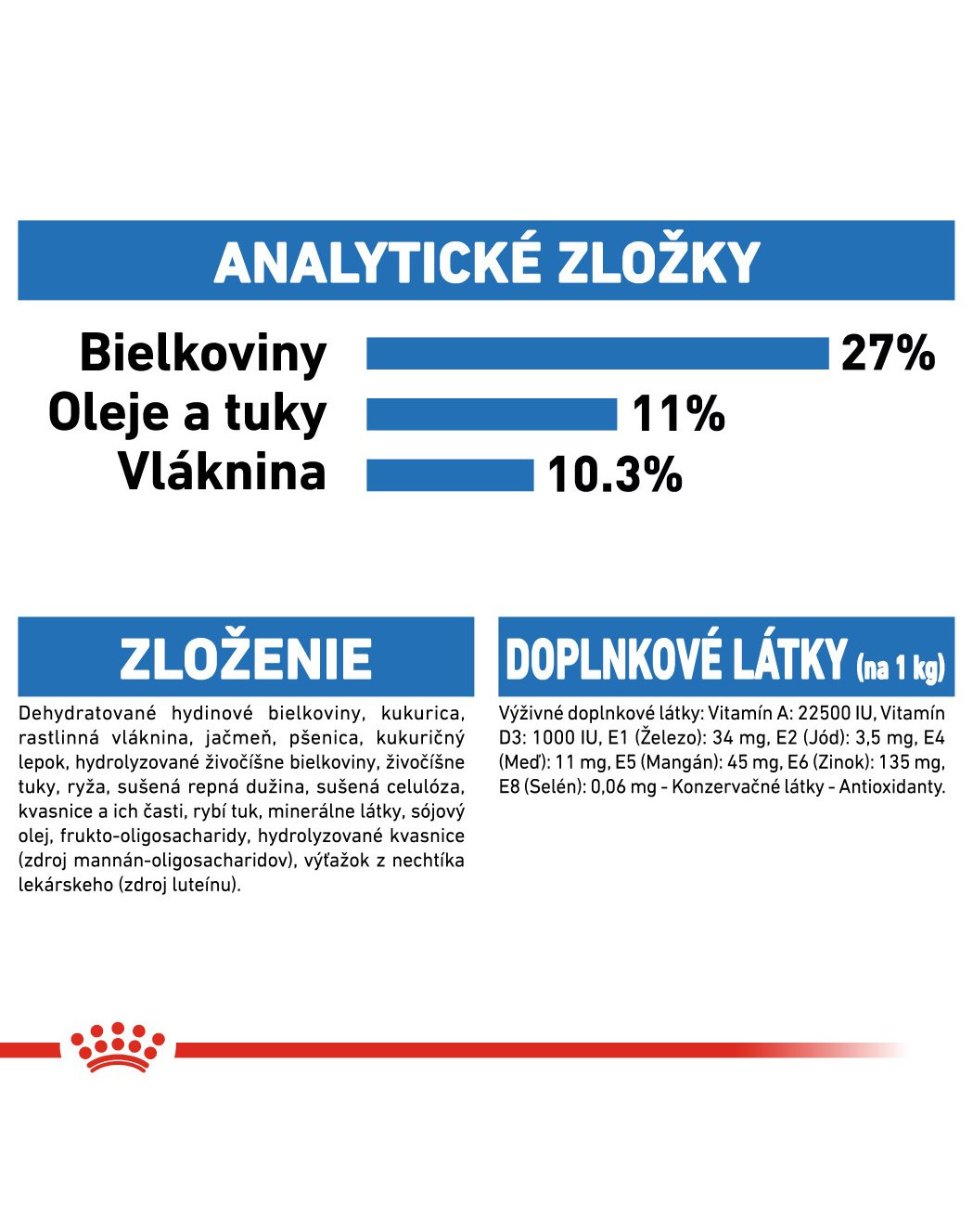 Zloženie: Dehydratované hydinové bielkoviny, rastlinná vláknina, kukurica, pšenica, jačmeň, kukuričný lepok, hydrolyzované živočíšne bielkoviny, kukuričná múka, živočíšne tuky, ryža, sušená repná dužina, sušená celulóza, rastlinný bielkovinový izolát*, kvasnice a ich časti, rybí tuk, minerálne látky, frukto-oligosacharidy, semená a plevy psyllia, sójový olej, hydrolyzované kvasnice (zdroj mannán-oligosacharidov), hydrolyzované kôrovce (zdroj glukozamínu), výťažok z nechtíka lekárskeho (zdroj luteínu), hydrolyzovaná chrupavka (zdroj chondroitínu).