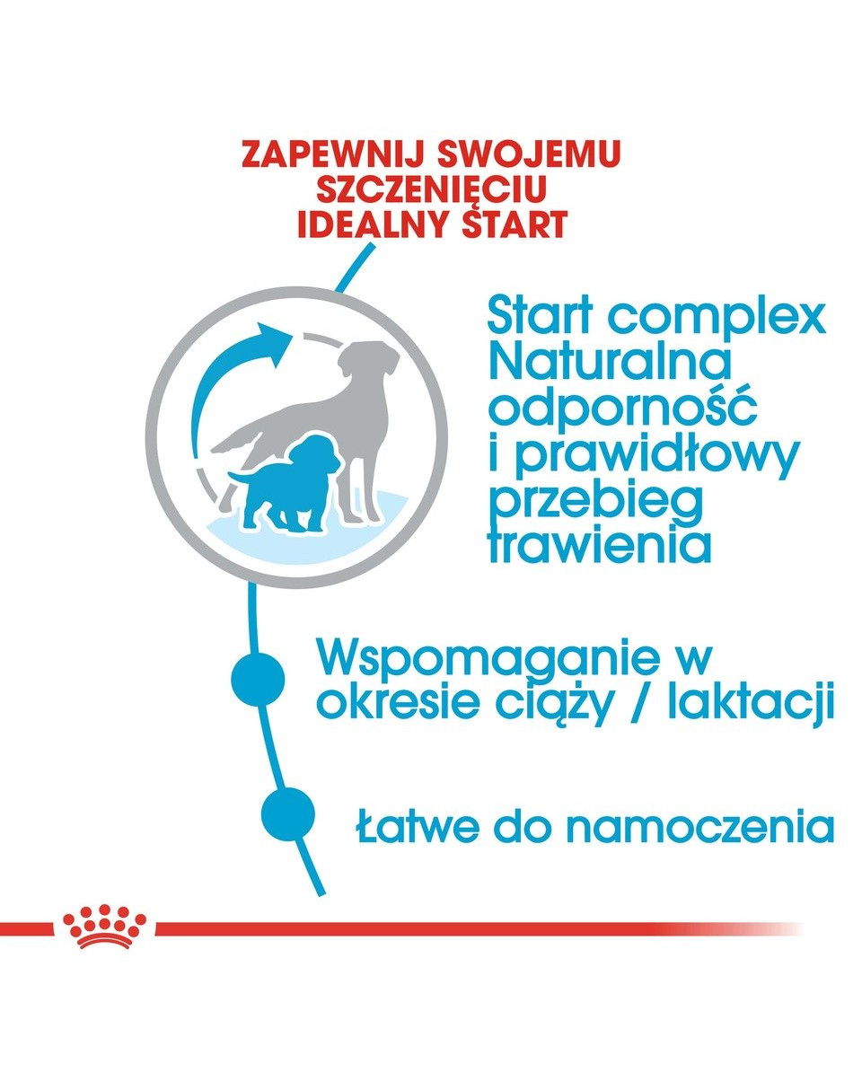 Royal Canin Starter Mother&Babydog Medium je kompletné superprémiové krmivo pre šteňatá (do 2 mesiacov veku) a brezivé/dojčiace suky stredných plemien (11 – 25 kg hmotnosti v dospelosti).