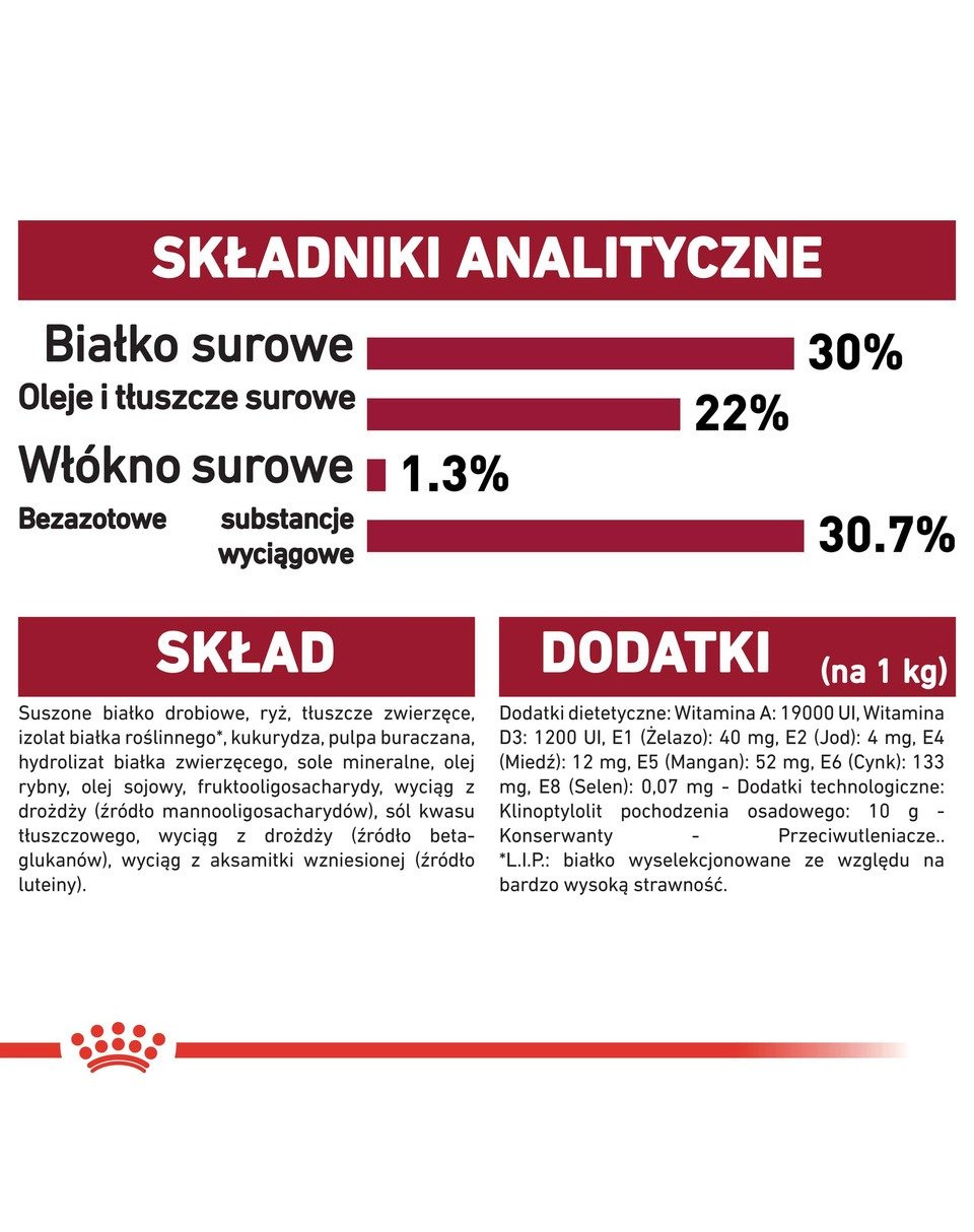 Zloženie: Sušená hydinová bielkovina, ryža, živočíšne tuky, pšeničný lepok *, kukurica, repné rezky, hydrolyzované živočíšne bielkoviny, minerálne látky, sójový olej, rybí tuk, fruktooligosacharidy, hydrolyzované kvasnice (zdroj manno-oligosacharidov a beta-glukánov) (0,30%), olej z rias Schizochytrium sp.(zdroj DHA kyselín), soľ kyseliny maslovej, nechtíková múčka.