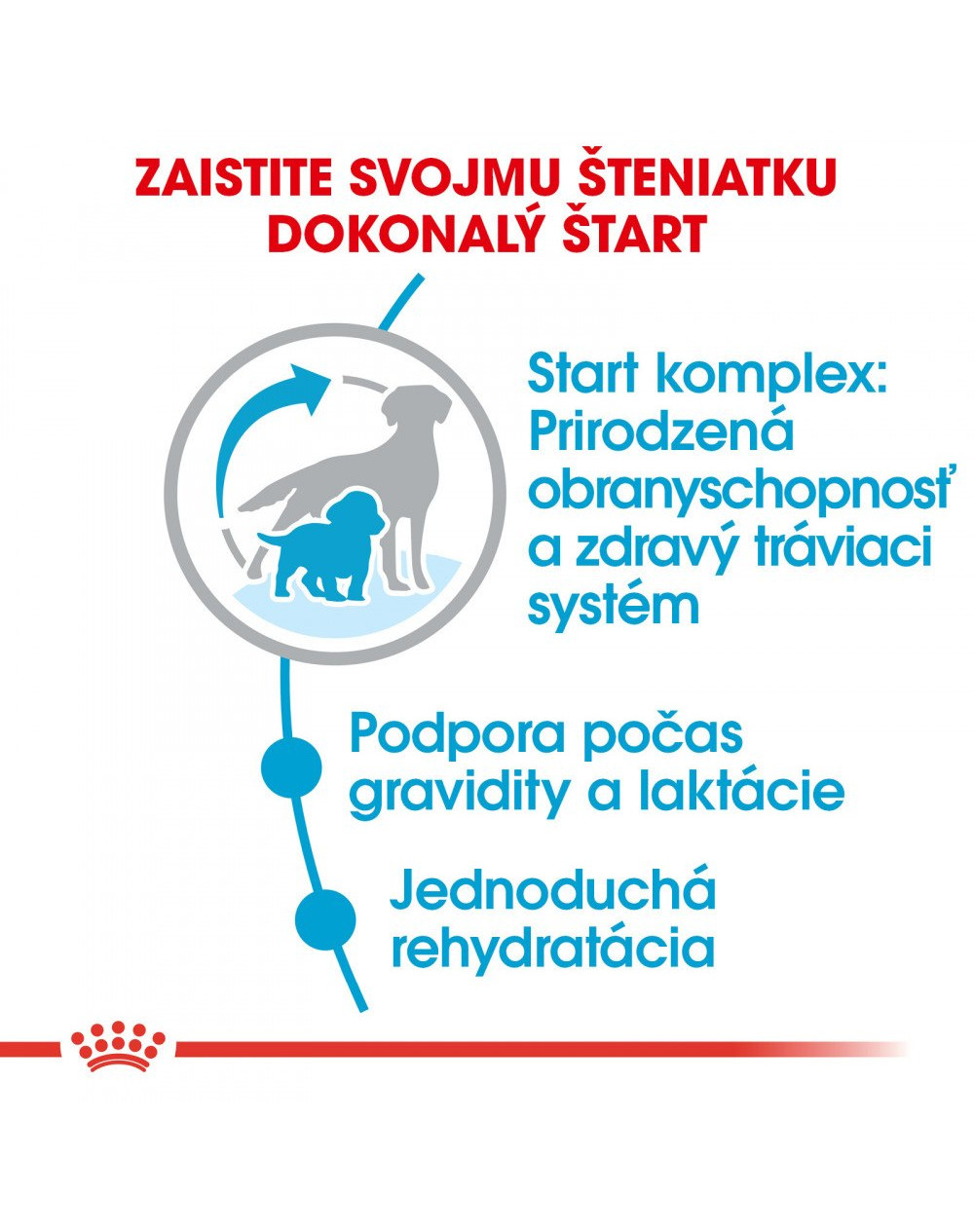 Zloženie krmiva ROYAL CANIN® Medium Starter Mother & Babydog je vytvorené tak, aby uspokojilo všetky nutričné potreby vašej sučky aj jej šteniat. ‘Štart Komplex’ je plodom neutíchajúceho výskumu spoločnosti ROYAL CANIN®: ide o exkluzívnu kombináciu výživových prvkov, ktoré sa nachádzajú v materskom mlieku. Tieto prvky sú posilnené špecifickými živinami, ktoré aktívne prispievajú k podpore zdravého trávenia šteniat. Krmivo tiež podporuje prirodzenú obranyschopnosť šteniat vo chvíli, keď sa ich imunitný systém ešte len začína vyvíjať. Výživový profil krmiva je upravený tak, aby uspokojoval vysoké energetické potreby vašej suky na konci gravidity a počas laktácie. Bezprostredne po pôrode bude vaša suka vysoký príjem energie potrebovať, aby si zachovala svoju silu.