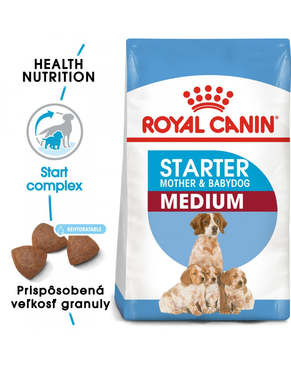 Royal Canin Starter Mother&Babydog Medium je kompletné superprémiové krmivo pre šteňatá (do 2 mesiacov veku) a brezivé/dojčiace suky stredných plemien (11 – 25 kg hmotnosti v dospelosti).