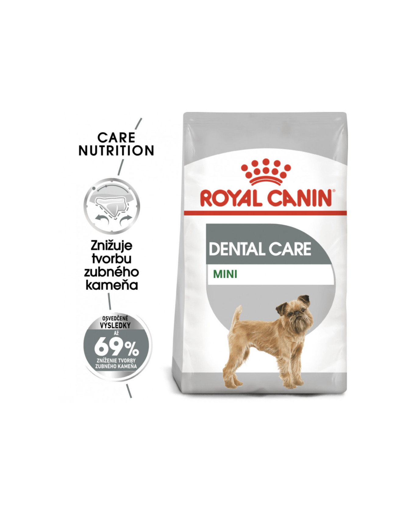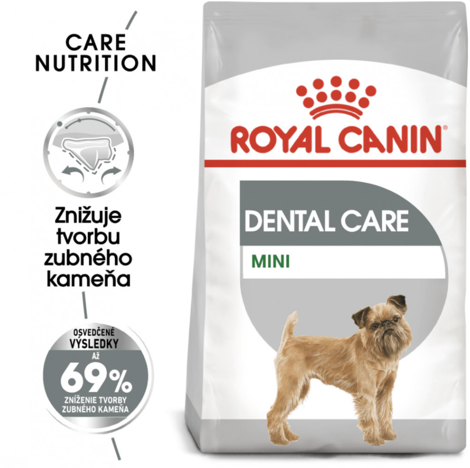 Royal Canin Mini Dental Care je kompletní krmivo vhodné pro psy s hmotností do 10 kg, kteří jsou náchylní na problémy se zuby. Váš psí společník má jen jeden chrup na celý život, proto je nezbytné jej chránit. Po jídle se mu na zubech přirozeně usazují bakterie. Pokud mu zuby nečistíte, může to mít za následek vznik plaku, který se nakonec stane zubním kamenem, což je pro zdraví vašeho psa velké riziko.