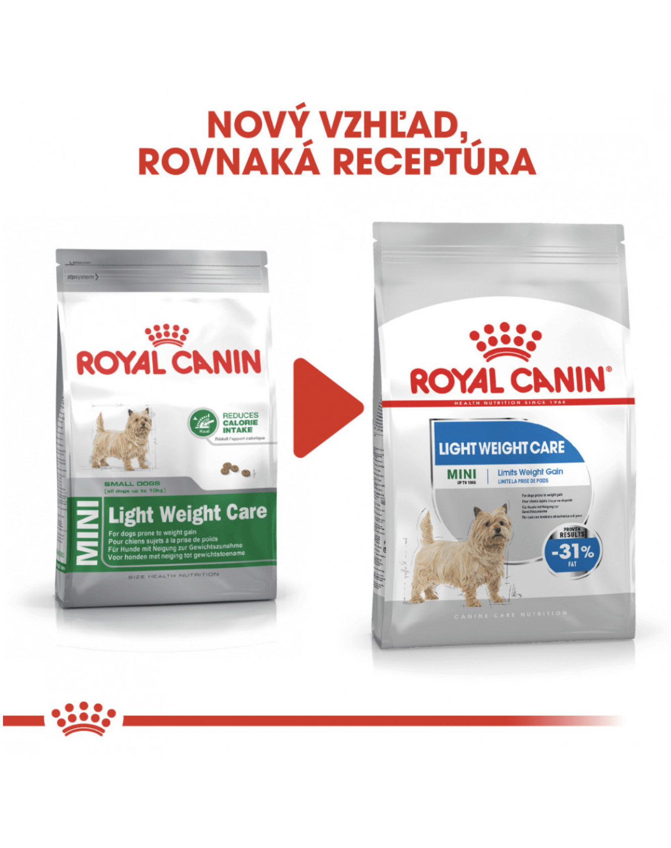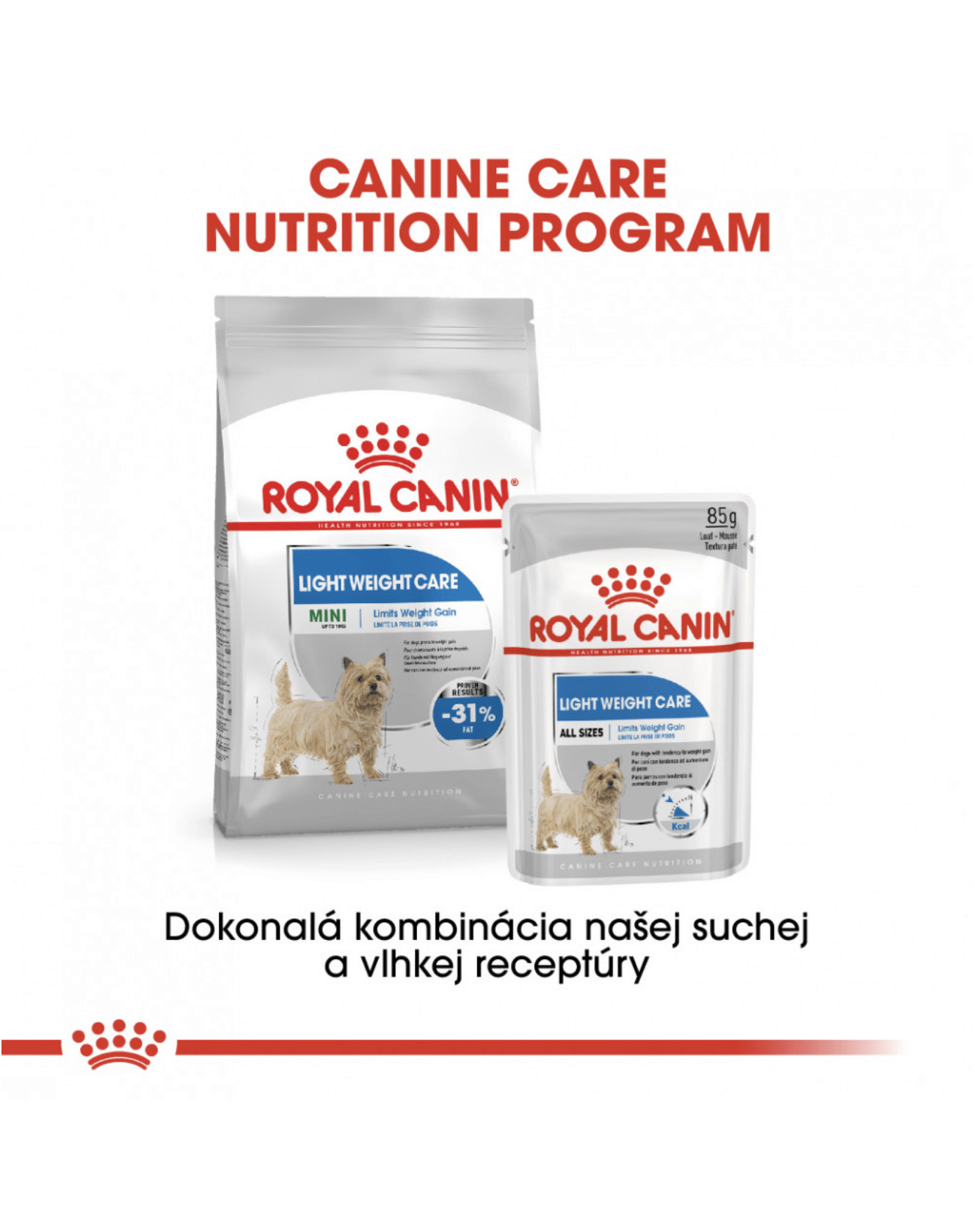 V rámci nutričného programu Ligth Weight Care sú k dispozícii dva typy produktov: chrumkavé granuly a lahodné paštéty v kapsičke, pričom oba typy sú z hľadiska výživy kompletné a perfektne sa navzájom dopĺňajú. Prečo nevyskúšať paštétu ako chutné doplnenie granúl? V chovateľských staniciach spoločnosti Royal Canin sa vedeckým testovaním preukázalo, že krmivo ROYAL CANIN® Light Weight Care Mini obsahuje o 31 % menej tuku než bežné krmivo pre dospelých psov. To znamená, že výsledky krmiva sú preukázané.