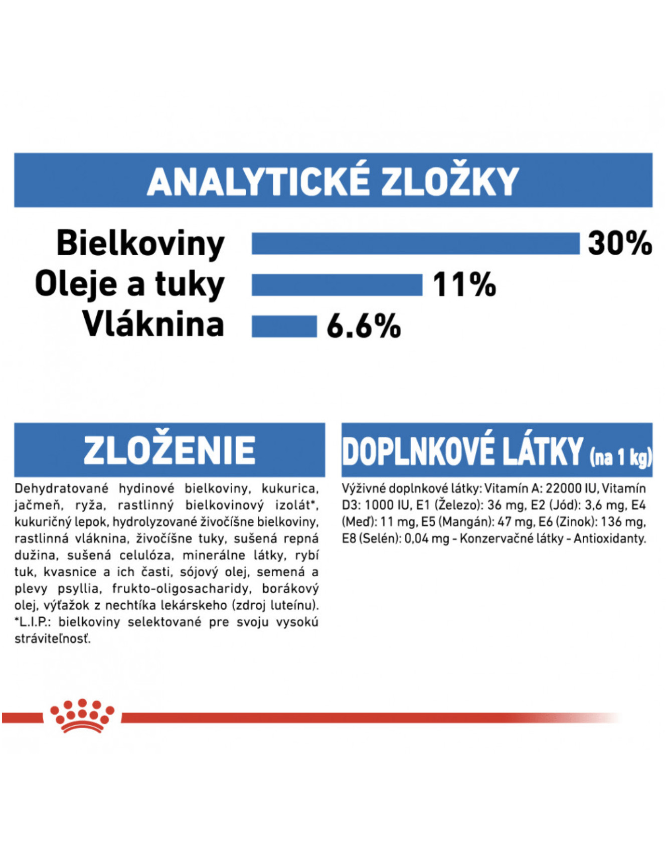 Zloženie: Dehydratované hydinové bielkoviny, kukurica, rastlinná vláknina, jačmeň, ryža, rastlinný bielkovinový izolát*, kukuričný lepok, hydrolyzované živočíšne bielkoviny, živočíšne tuky, sušená repná dužina, kukuričná múka, sušená celulóza, rybí tuk, semená a plevy psyllia, kvasnice a ich časti, minerálne látky, sójový olej, soľ mastnej kyseliny, frukto-oligosacharidy, borákový olej, hydrolyzované kôrovce (zdroj glukozamínu), výťažok z nechtíka lekárskeho (zdroj luteínu), hydrolyzovaná chrupavka (zdroj chondroitínu).