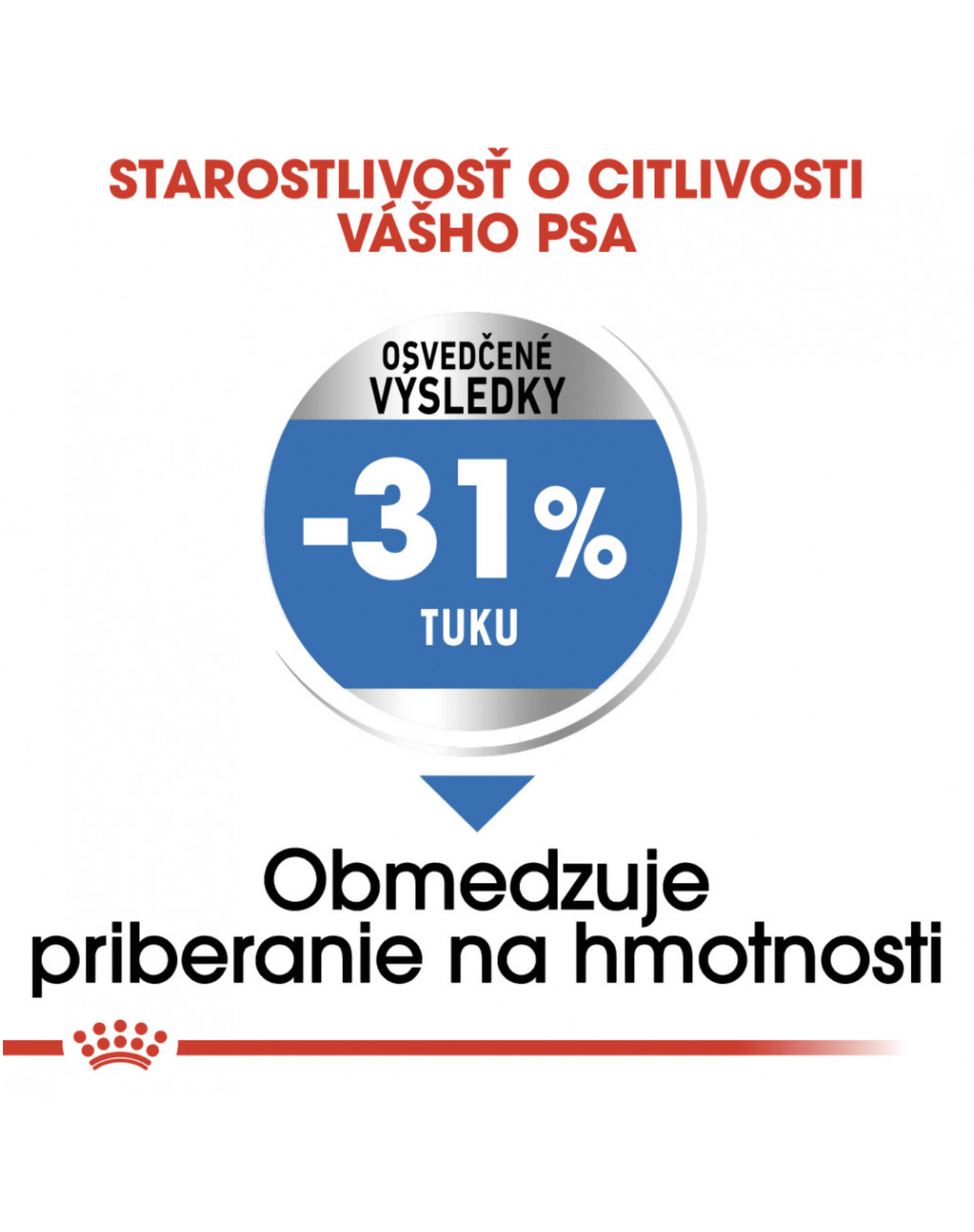 Krmivo ROYAL CANIN® Light Weight Care Mini je vhodné pre psov s aktuálnou hmotnosťou do 10 kg. Táto chutná receptúra je bohatá na ľahko stráviteľné bielkoviny, vďaka čomu sa počas znižovania príjmu tukov a kalórií nebude strácať svalová hmota. Toto zloženie je bohaté na vzácne omega-3 mastné kyseliny EPA a DHA s dlhým reťazcom, ktoré chránia kĺby psov. Vďaka optimálnej kombinácii rozpustnej a nerozpustnej vlákniny bude mať váš pes pocit nasýtenia. Vláknina taktiež zabezpečuje pravidelnú a zdravú črevnú peristaltiku a lepšie trávenie. Jednou z dôležitých vlastností Omega-3 mastných kyselín je ich protizápalový účinok.
