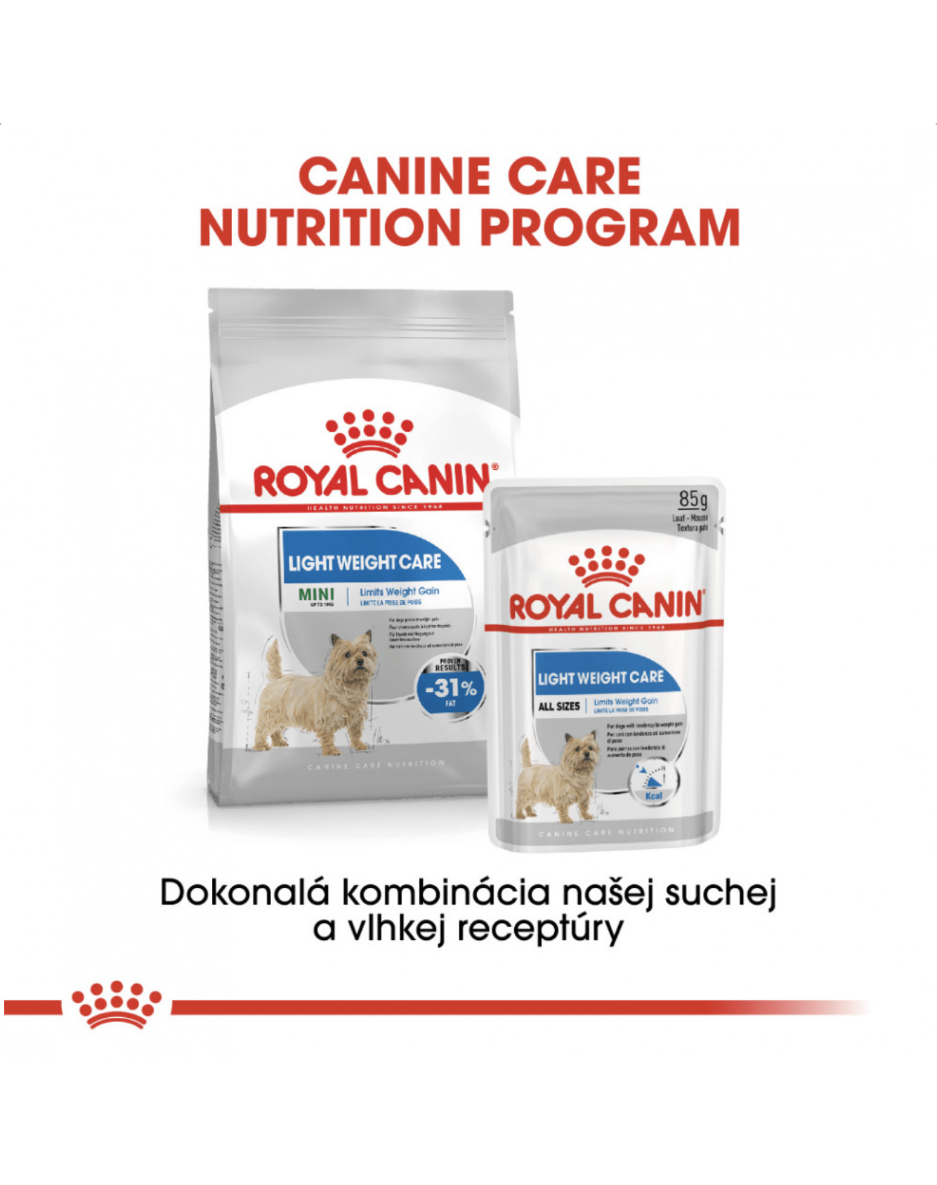 V rámci nutričného programu Ligth Weight Care sú k dispozícii dva typy produktov: chrumkavé granuly a lahodné paštéty v kapsičke, pričom oba typy sú z hľadiska výživy kompletné a perfektne sa navzájom dopĺňajú. Prečo nevyskúšať paštétu ako chutné doplnenie granúl? V chovateľských staniciach spoločnosti Royal Canin sa vedeckým testovaním preukázalo, že krmivo ROYAL CANIN® Light Weight Care Mini obsahuje o 31 % menej tuku než bežné krmivo pre dospelých psov. To znamená, že výsledky krmiva sú preukázané.