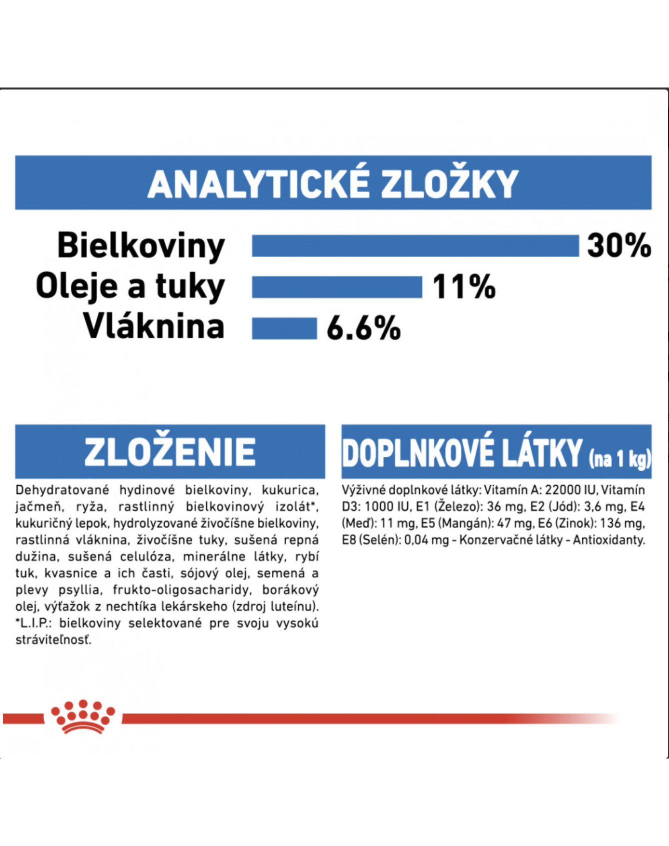 Zloženie: Dehydratované hydinové bielkoviny, kukurica, rastlinná vláknina, jačmeň, ryža, rastlinný bielkovinový izolát*, kukuričný lepok, hydrolyzované živočíšne bielkoviny, živočíšne tuky, sušená repná dužina, kukuričná múka, sušená celulóza, rybí tuk, semená a plevy psyllia, kvasnice a ich časti, minerálne látky, sójový olej, soľ mastnej kyseliny, frukto-oligosacharidy, borákový olej, hydrolyzované kôrovce (zdroj glukozamínu), výťažok z nechtíka lekárskeho (zdroj luteínu), hydrolyzovaná chrupavka (zdroj chondroitínu).