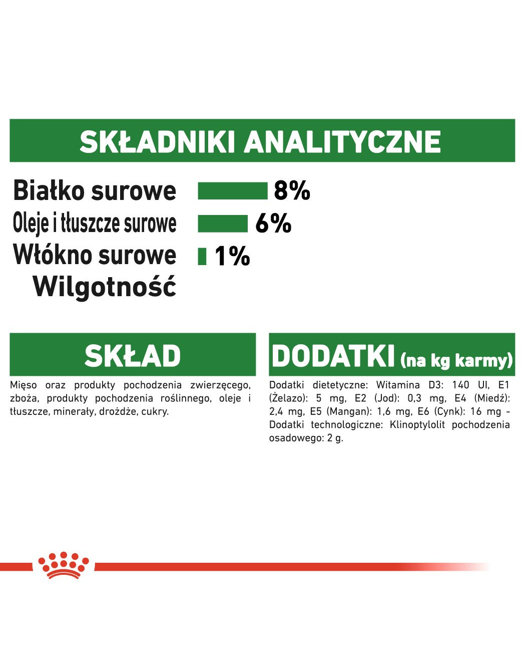 Bielkoviny 8%, surový tuk 6%, vláknina 1%, popol 2%, vlhkosť 79%, vitamín E 150 mg.
