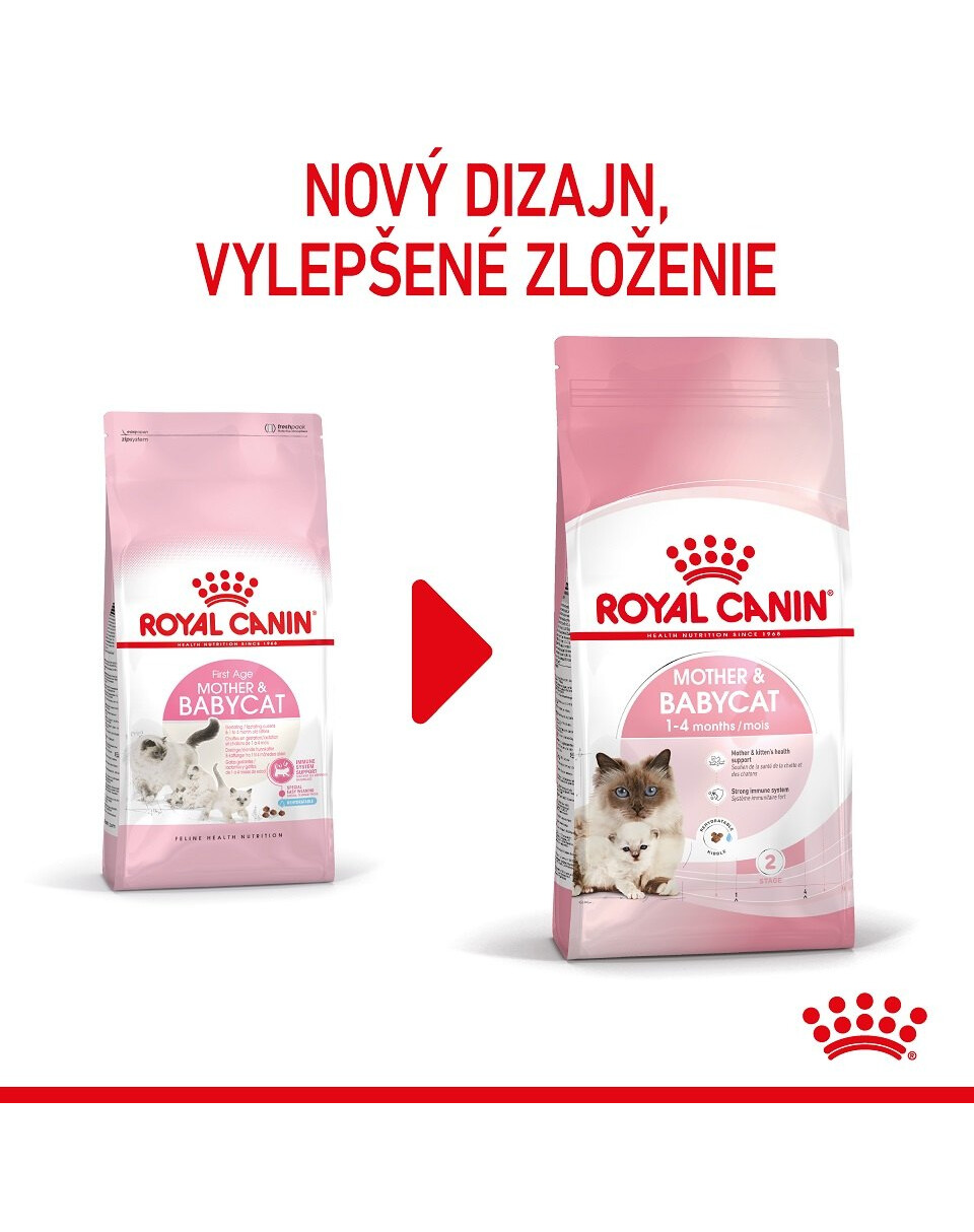 ROYAL CANIN® Mother & Babycat je špeciálne upravený tak, aby vyhovoval vysokým energetickým potrebám vašej mačky na konci gravidity a počas laktácie. Je tiež formulovaný tak, aby podporoval zdravý vývoj dojčiacich mačiatok až do veku 4 mesiacov.