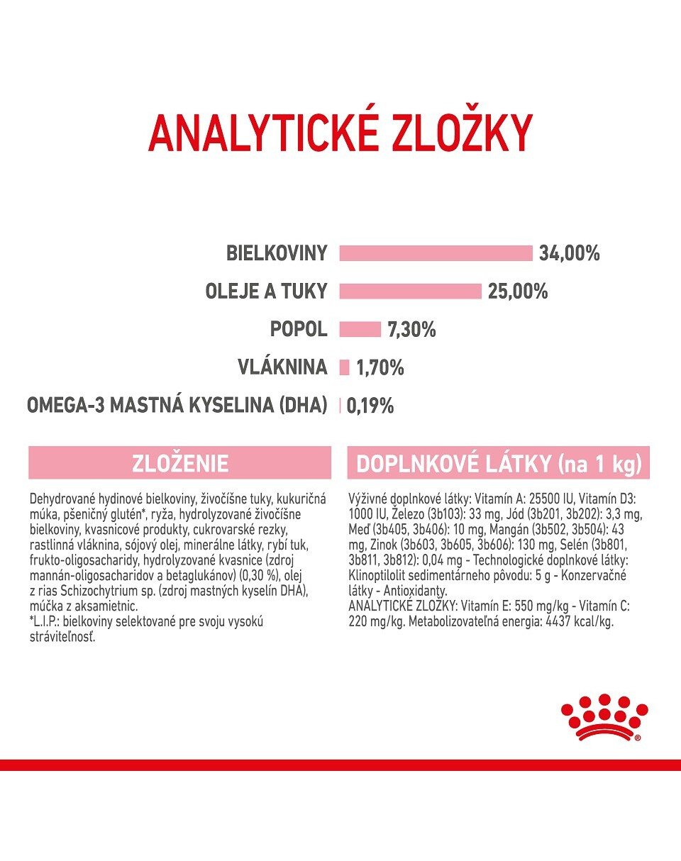 Novonarodené mačiatka dostávajú ochranné protilátky z mledziva svojej matky, ale táto ochrana časom slabne. ROYAL CANIN® Mother & Babycat obsahuje osvedčený komplex vrátane vitamínov C a E na podporu zdravého vývoja imunitného systému. Táto receptúra je obohatená o omega-3 mastné kyseliny (DHA) pre podporu vývoja mozgu a zdravého zraku u malých mačiatok.