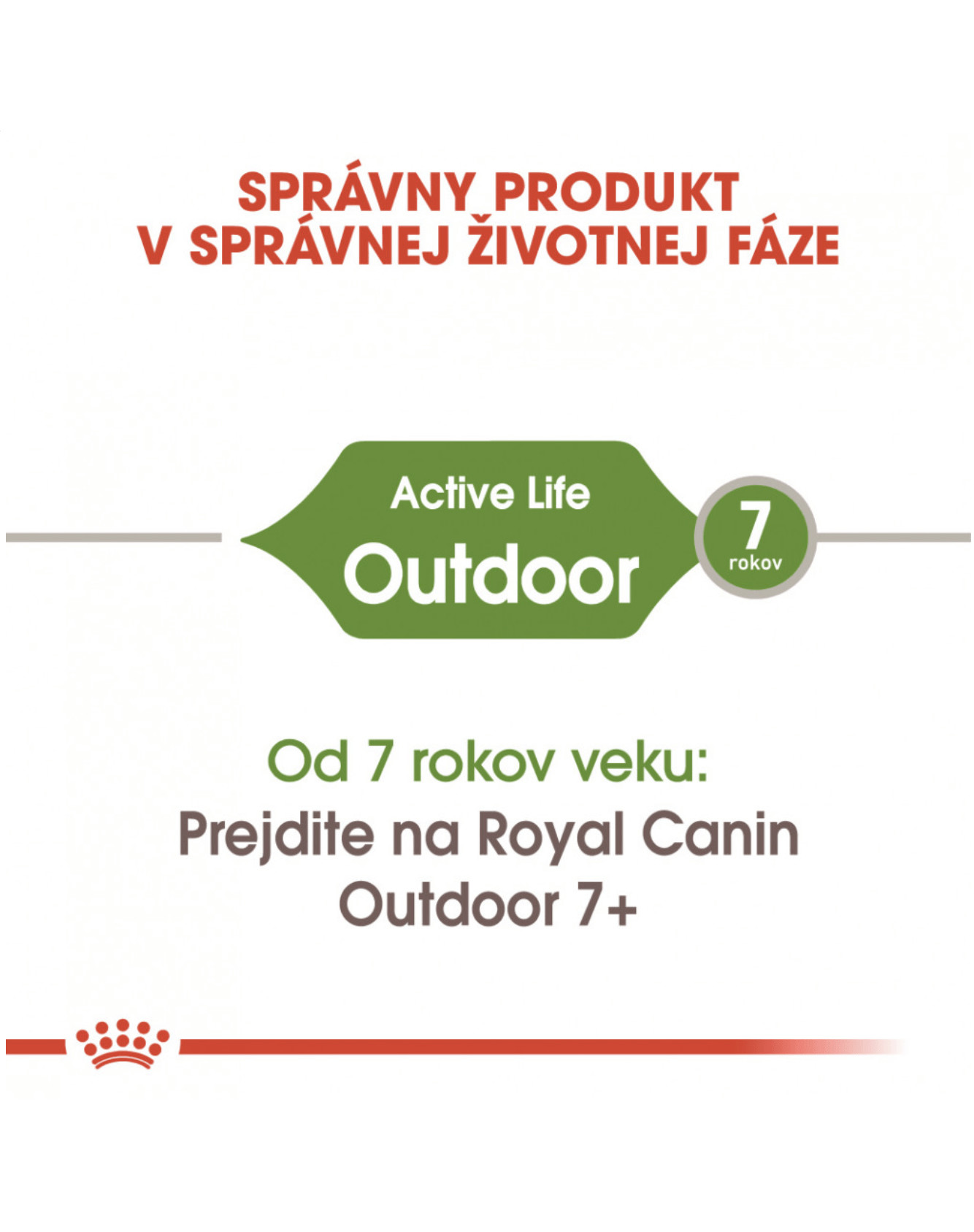 Zloženie krmiva ROYAL CANIN® Outdoor je vytvorené tak, aby uspokojilo potreby vonkajších mačiek a obsahuje všetky živiny, ktoré aktívna mačka vyžaduje. Krmivo má vysoký kalorický obsah, ktorý uspokojuje nutričné nároky aktívnych mačiek, ako je tá vaša. Vysoký podiel energie tiež pomôže vašej mačke vyrovnať sa s meniacim sa počasím počas roka. Granuly sú obohatené o antioxidanty, ktoré podporujú imunitný systém vašej mačky. Pridané probiotiká zasa podporujú rovnováhu črevnej mikroflóry. Špecifická kombinácia živín podporuje funkciu kožnej bariéry, dobrý stav kože i srsti a celkové zdravie vašej mačky.