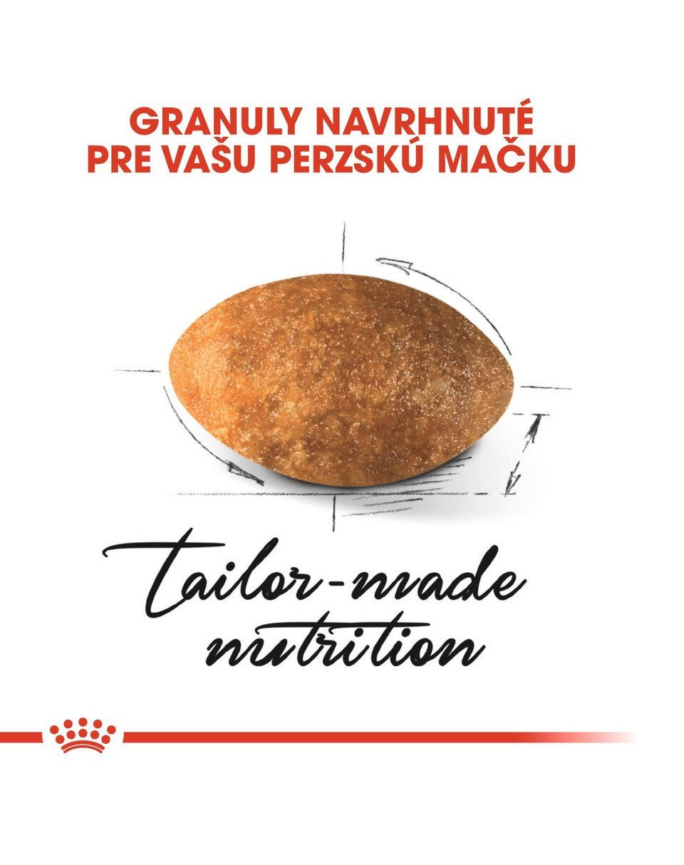 Vďaka Royal Canin Persian Adult sú však uvoľnené požité chlpy eliminované, tvorba chlpových zmotkov je kontrolovaná a črevný priechod je prirodzene stimulovaný prostredníctvom špecifickej zmesi vlákniny (vrátane psyllia bohatého na sliz). Tráviaci výkon je tiež udržovaný vďaka nízko nestráviteľným bielkovinám (L.I.P), prebiotikám a omega 3 a 6 mastným kyselinám. Granule vyrobené na mieru: Royal Canin Persian Adult majú mandľový tvar s optimálnou kontaktnou plochou – čo uľahčuje perzským mačkám uchopenie granúl a žuvanie. Peržan je stredne veľká mačka, ale môže sa zdať väčšia, než je vďaka objemnej srsti a podsade, ktorá ich obklopuje. Na dosiahnutie najlepších výsledkov odporúčame každý deň upravovať a rozčesávať ich srsť. Aby bolo vyhovené individuálnym preferenciám každej mačky, je krmivo Royal Canin Persian Adult dostupné aj ako vlhké krmivo vo forme kapsičiek v šťave. Pokiaľ uvažujete o kombinovanom kŕmení, jednoducho postupujte podľa našich pokynov na kŕmenie, aby ste zaistili, že vaša mačka dostane presné množstvo vlhkého aj suchého krmiva pre optimálny úžitok. V Royal Canin sme odhodlaní poskytovať nutričné riešenie pre potreby vášho maznáčika. Všetky naše produkty prechádzajú rozsiahlym procesom kontroly kvality, aby bola zaručená optimálna kvalita krmiva a aby vyhovovali špecifickým diétnym požiadavkám a životnému štýlu vašej mačky. To znamená, že keď vaša mačka jej krmivo RRoyal Canin Persian Adult, dostáva kompletnú a vyváženú stravu.
