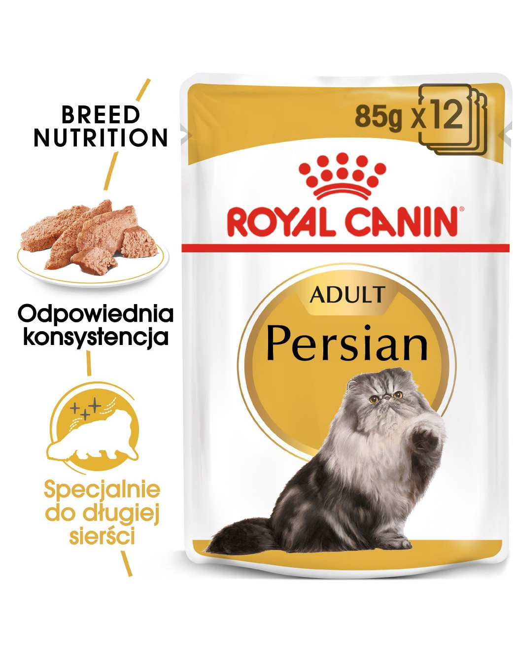 Forma chutnej paštéty, prispôsobená štruktúre lebky a spôsobu prijímania potravy, stimuluje chuť do jedla perzských mačiek. Receptúra podporuje správne trávenie vďaka vysoko stráviteľným bielkovinám, jedinečnému zloženiu vlákniny a primeranému obsahu vitamínov a minerálnych solí.