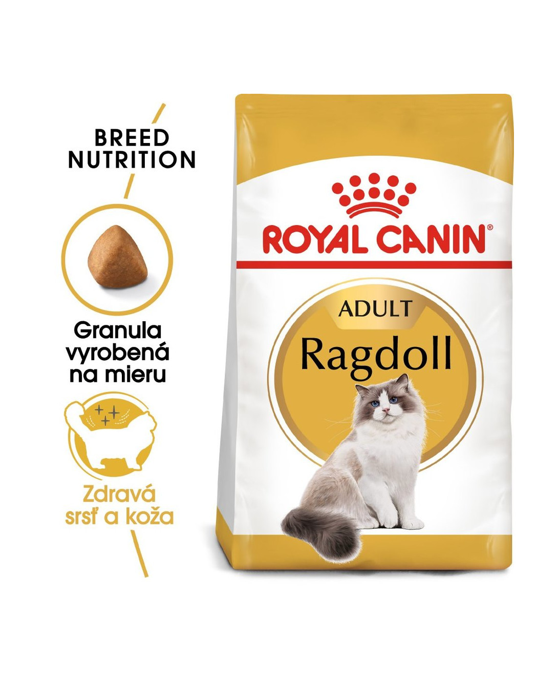 Granula krmiva ROYAL CANIN® Ragdoll Adult je špeciálne navrhnutá pre širokú čeľusť mačky Ragdoll. Táto granula sa jej ľahko uchopuje, podporuje žuvanie a zlepšuje kvalitu ústnej hygieny.