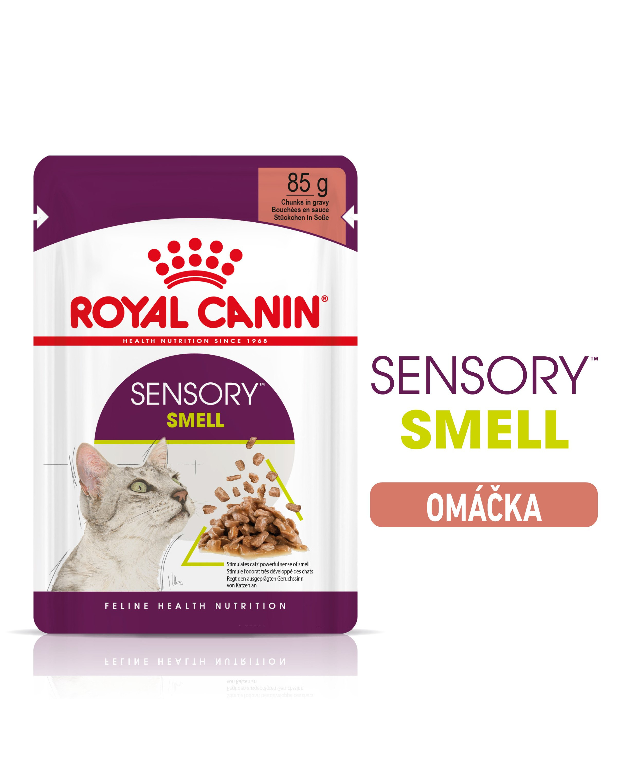 ROYAL CANIN® Sensory Smell je špeciálne vyvinutý tak, aby stimuloval a apeloval na silný a rafinovaný čuch vašej mačky, a zároveň podporoval optimálne zdravie a pohodu prostredníctvom senzorických variácií.