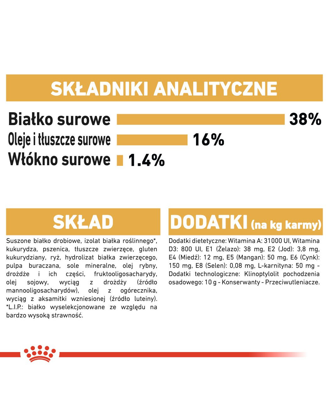 ZLOŽENIE: dehydrované kuracie proteíny, izolát rastlinných proteínov *, kukurica, pšenica, živočíšne tuky, kukuričný glutén, ryža, hydrolyzované živočíšne proteíny, repné rezky, minerálne látky, rybí tuk, kvasnice a ich časti, frukto-oligosacharidy, sójový olej, hydrolyzát droždie (zdroj mannán-oligosacharidov), olej z boráku lekárskeho, výťažok z nechtíka lekárskeho (zdroj luteínu). DOPLNKOVÉ LÁTKY (na 1 kg): Výživné doplnkové látky: Vitamín A: 31000 IU., Vitamín D3: 800 mj., E1 (Železo): 38 mg, E2 (Jód): 3,8 mg, E4 (Meď): 12 mg, E5 (Mangán): 50 mg, E6 (Zinok): 150 mg, E8 (Selén): 0,08 mg, L-karnitín: 50 mg - Technologické doplnkové látky: Klinoptilolit sedimentárneho pôvodu: 10 g - Konzervačné látky - Antioxidanty. ANALYTICKÉ ZLOŽKY: Proteín: 38% - Obsah tuku: 16% - Popol: 7,7% - Vláknina: 1,4% - V 1 kg: Omega 6 mastné kyseliny: 37,7 g - Omega 3 mastné kyseliny: 7 , 9 g. DÁVKOVANIE: viď tabuľka. Výrobný kód, registračné číslo a dátum minimálnej trvanlivosti sú uvedené na obale. Skladujte v suchu a chlade. * L.I.P .: proteíny vybrané pre svoju veľmi vysokú stráviteľnosť.